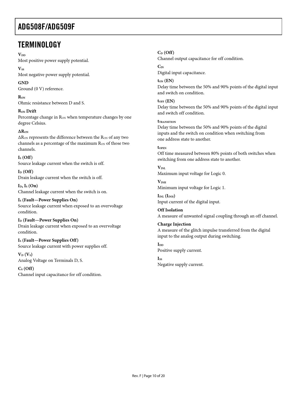 Pages / Page20 / 10 — ADG508F/ADG509F. TERMINOLOGY V. CD (Off). CIN. GND. tON (EN). RON. tOFF …