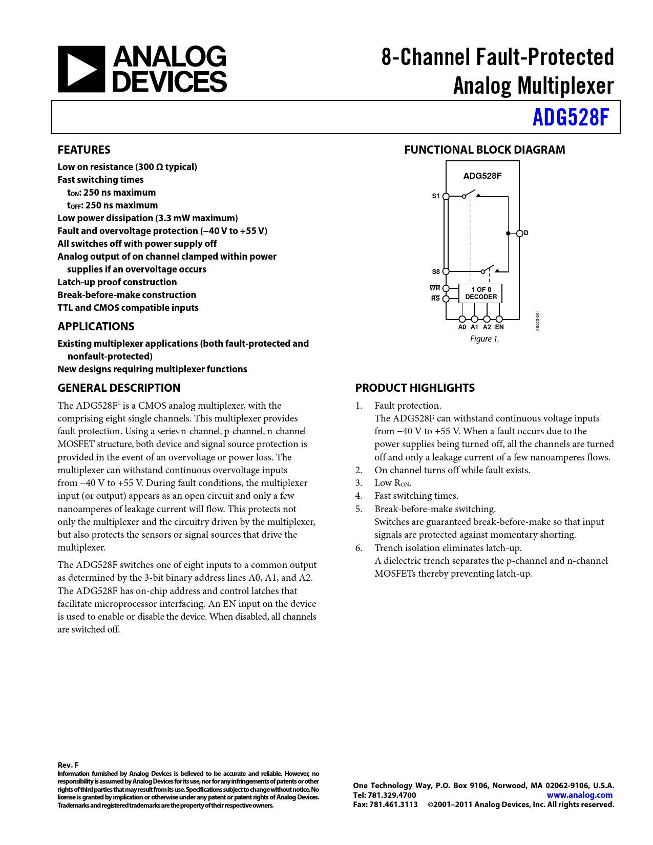 8-Channel Fault-Protected. Analog Multiplexer. ADG528F. FEATURES. FUNCTIONAL BLOCK DIAGRAM