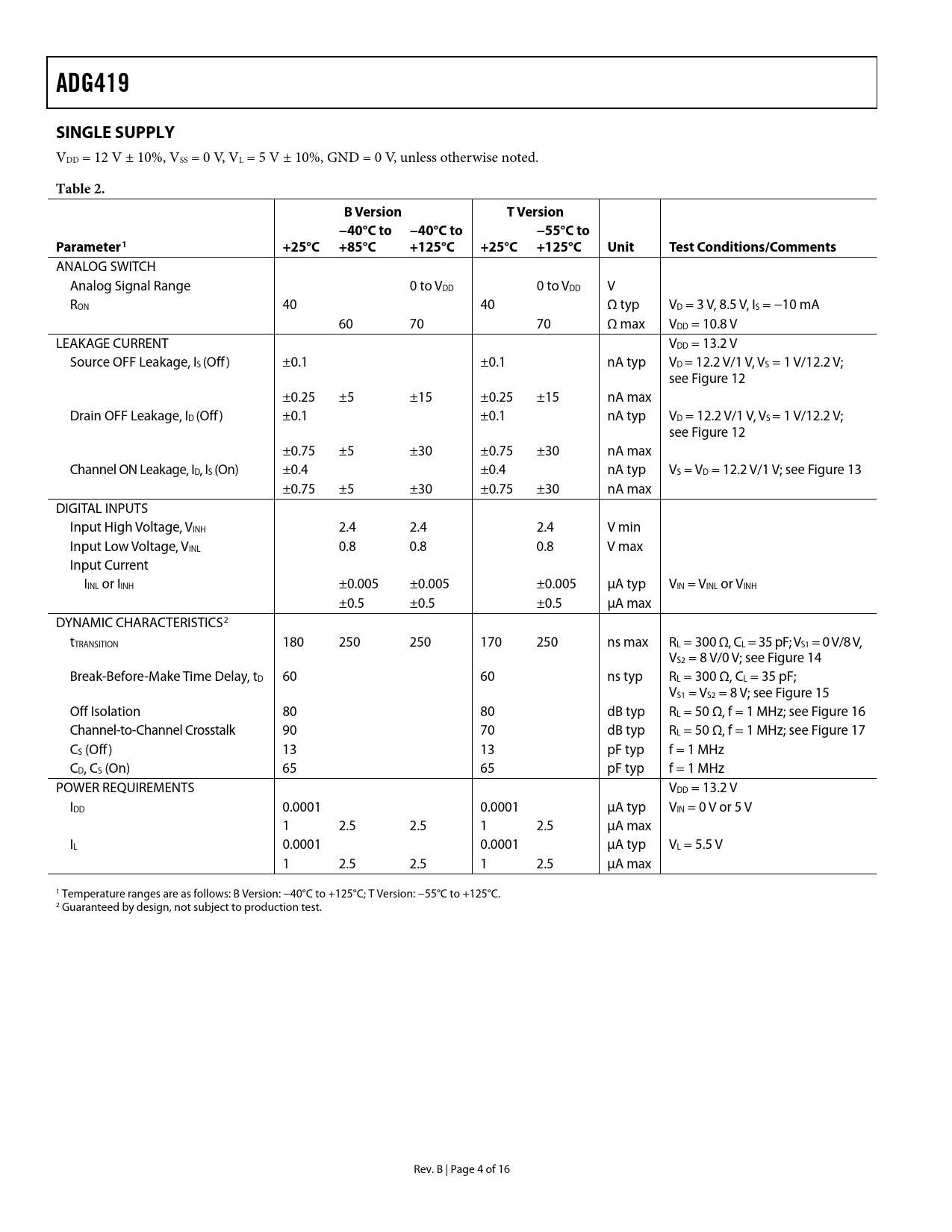 ADG419. SINGLE SUPPLY. Table 2. B Version. T Version. −40°C to. −55°C to. Parameter1. +25°C. +85°C. +125°C +25°C. +125°C. Unit