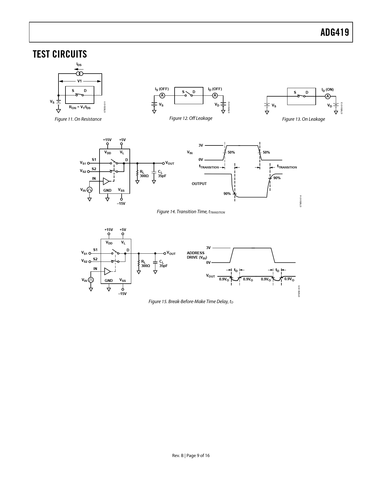 ADG419. TEST CIRCUITS. IDS. IS (OFF). ID (OFF). D (ON). ON = V1/IDS. +15V. +5V. 50%. VS1. VOUT. tTRANSITION. 300Ω. 35pF. 90%. OUTPUT. VIN. GND. –15V