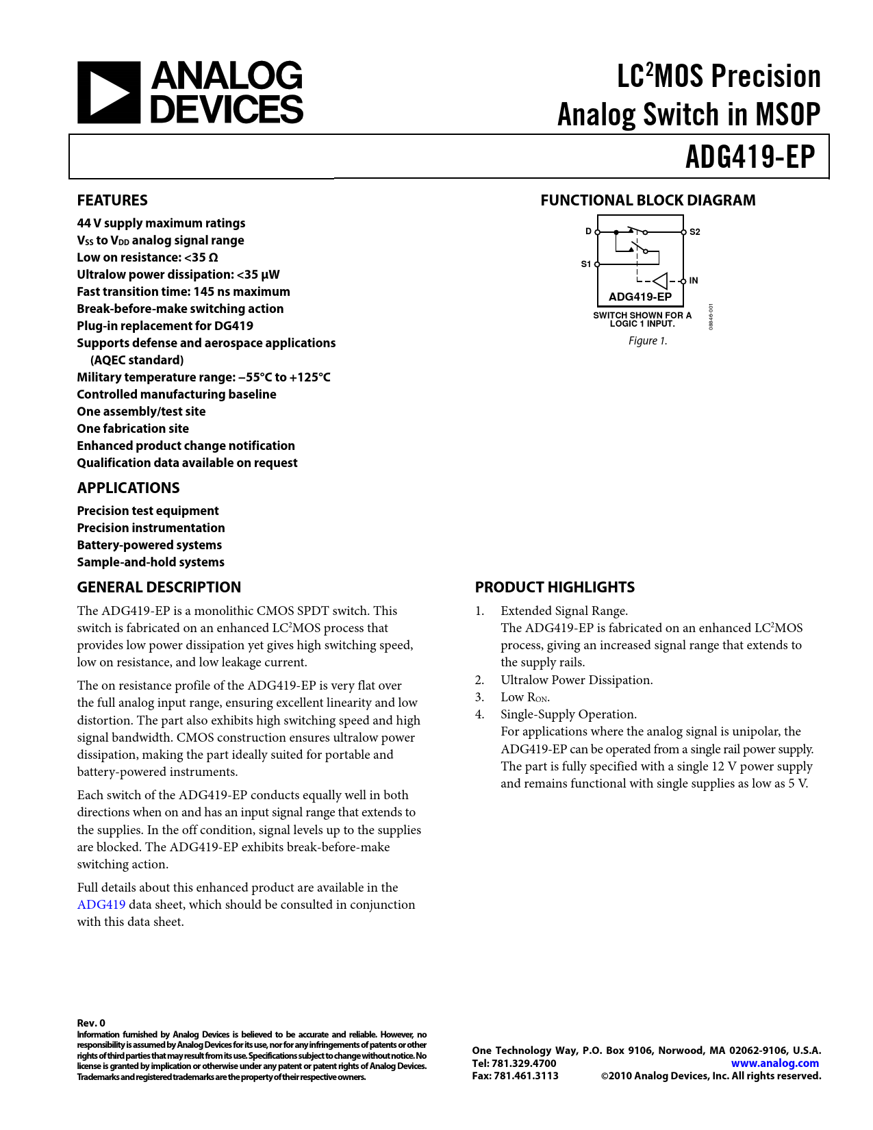 | Pages / Page | 12 / 1 — LC2MOS Precision. Analog Switch in MSOP. ADG419-EP. FEATURES. FUNCTIONAL … |