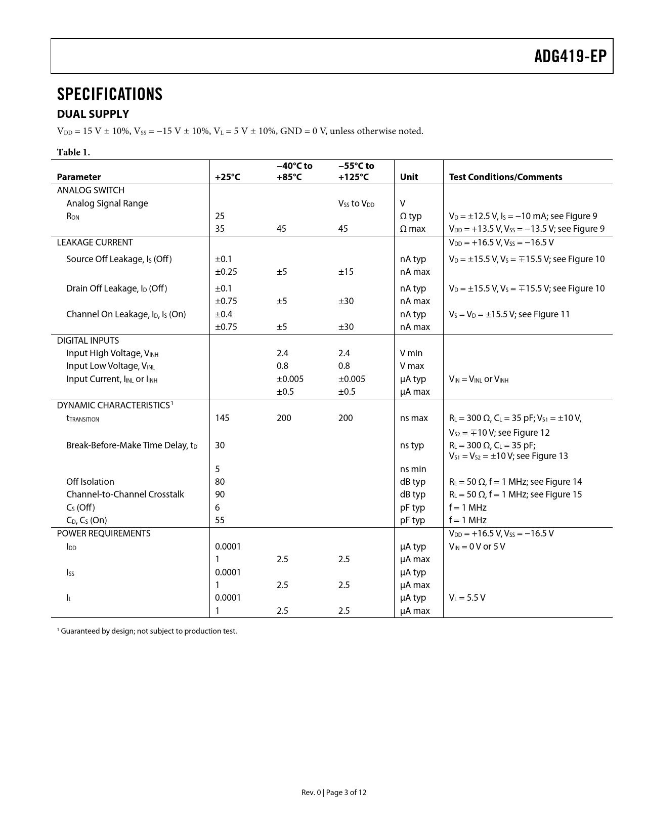 Pages / Page12 / 3 — ADG419-EP. SPECIFICATIONS DUAL SUPPLY. Table 1. −40°C to. −55°C to. …