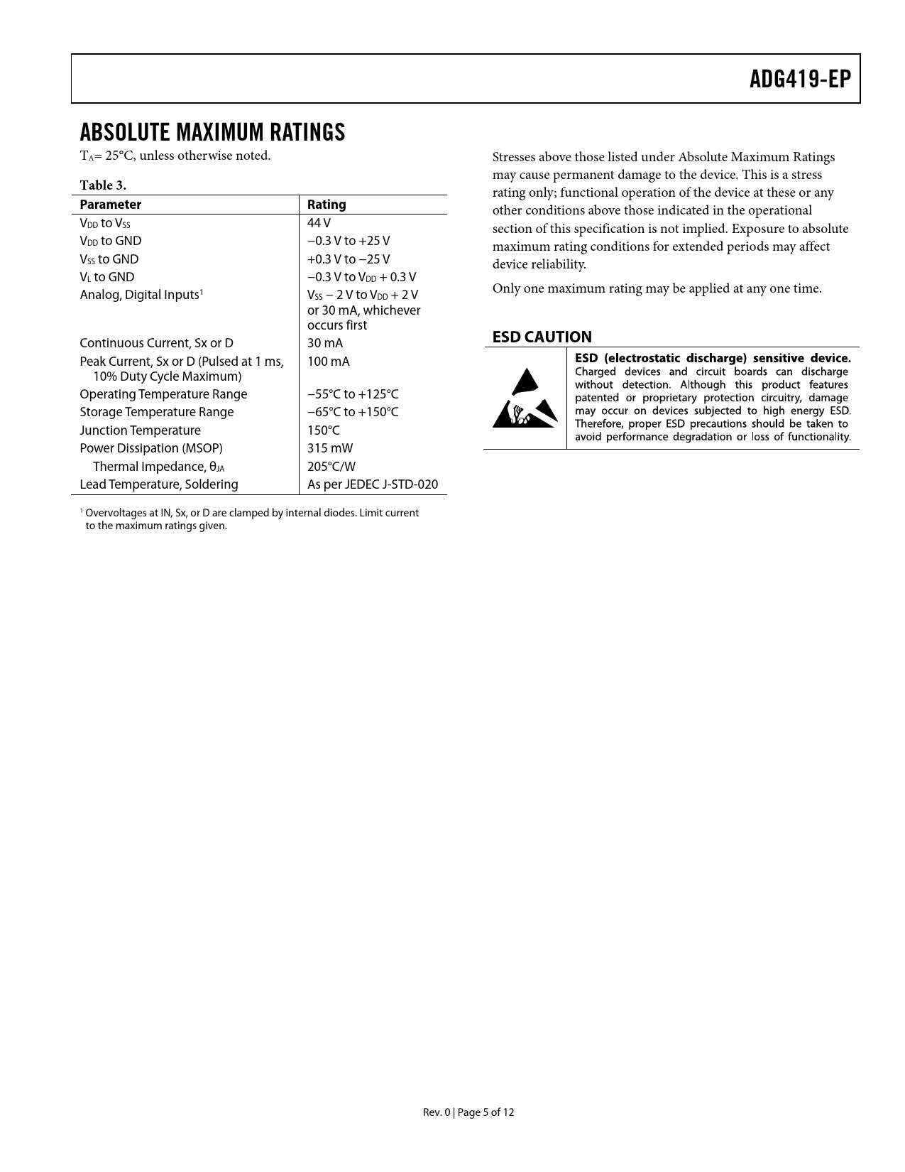link to page 5 ADG419-EPABSOLUTE MAXIMUM RATINGS TA= 25°C, unless otherwise noted. Stresses above those listed under Absolute Maximum Ratings may cause permanent damage to the device. This is a stress Table 3. rating only; functional operation of the device at these or any Parameter Rating other conditions above those indicated in the operational VDD to VSS 44 V section of this specification is not implied. Exposure to absolute VDD to GND −0.3 V to +25 V maximum rating conditions for extended periods may affect VSS to GND +0.3 V to −25 V device reliability. VL to GND −0.3 V to VDD + 0.3 V Only one maximum rating may be applied at any one time. Analog, Digital Inputs1 VSS − 2 V to VDD + 2 V or 30 mA, whichever occurs first ESD CAUTION Continuous Current, Sx or D 30 mA Peak Current, Sx or D (Pulsed at 1 ms, 100 mA 10% Duty Cycle Maximum) Operating Temperature Range −55°C to +125°C Storage Temperature Range −65°C to +150°C Junction Temperature 150°C Power Dissipation (MSOP) 315 mW Thermal Impedance, θ JA 205°C/W Lead Temperature, Soldering As per JEDEC J-STD-020 1 Overvoltages at IN, Sx, or D are clamped by internal diodes. Limit current to the maximum ratings given. Rev. 0 | Page 5 of 12 Document Outline FEATURES APPLICATIONS FUNCTIONAL BLOCK DIAGRAM GENERAL DESCRIPTION PRODUCT HIGHLIGHTS TABLE OF CONTENTS REVISION HISTORY SPECIFICATIONS DUAL SUPPLY SINGLE SUPPLY ABSOLUTE MAXIMUM RATINGS ESD CAUTION PIN CONFIGURATION AND FUNCTION DESCRIPTIONS TYPICAL PERFORMANCE CHARACTERISTICS TEST CIRCUITS OUTLINE DIMENSIONS ORDERING GUIDE