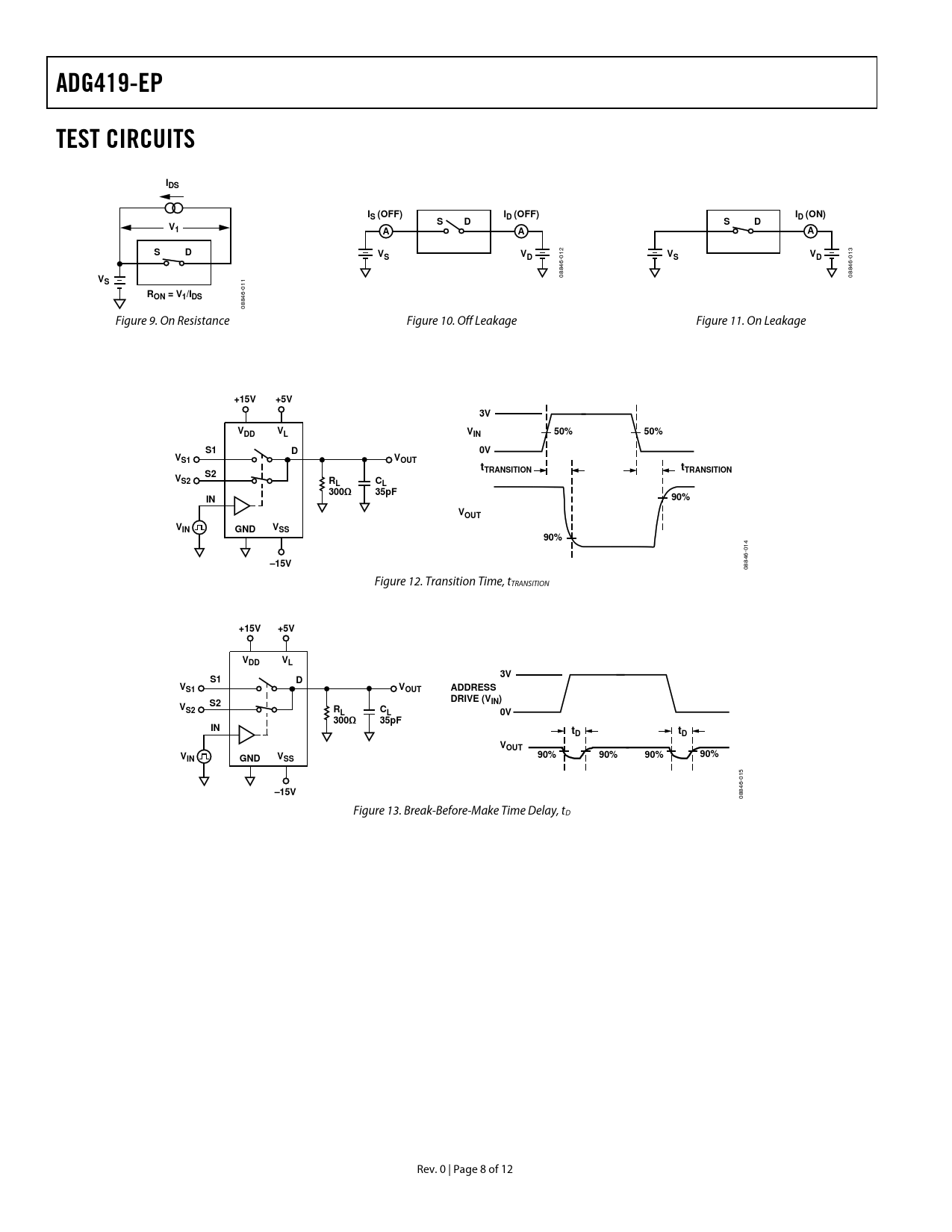 ADG419-EP. TEST CIRCUITS. IDS. IS (OFF). ID (OFF). ID (ON). ON = V1/IDS. +15V. +5V. 50%. VS1. VOUT. tTRANSITION. 300Ω. 35pF. 90%. VIN. GND. –15V