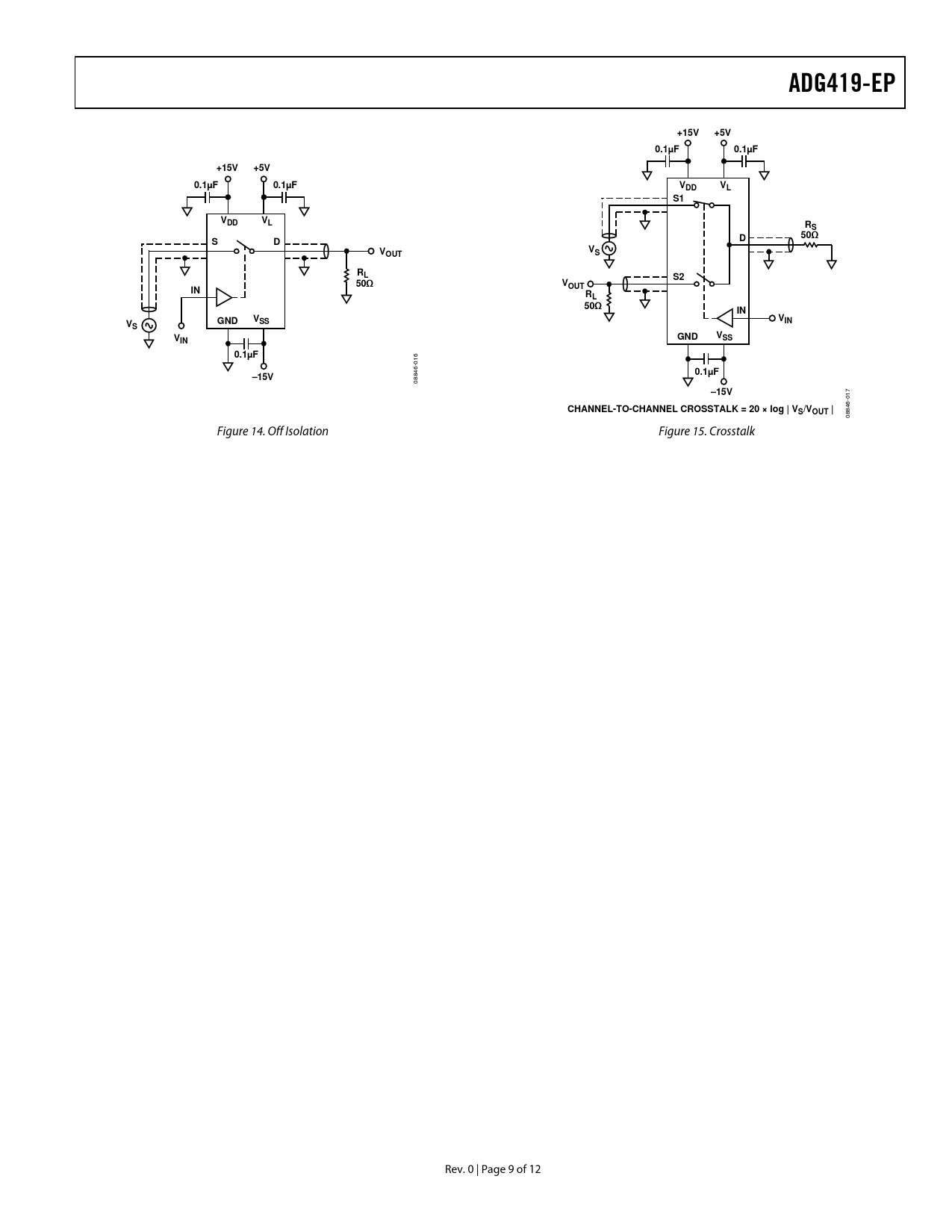 | Pages / Page | 12 / 9 — ADG419-EP. +15V. +5V. 0.1µF. VDD. 50Ω. OUT. GND. –15V. CHANNEL-TO-CHANNEL … |