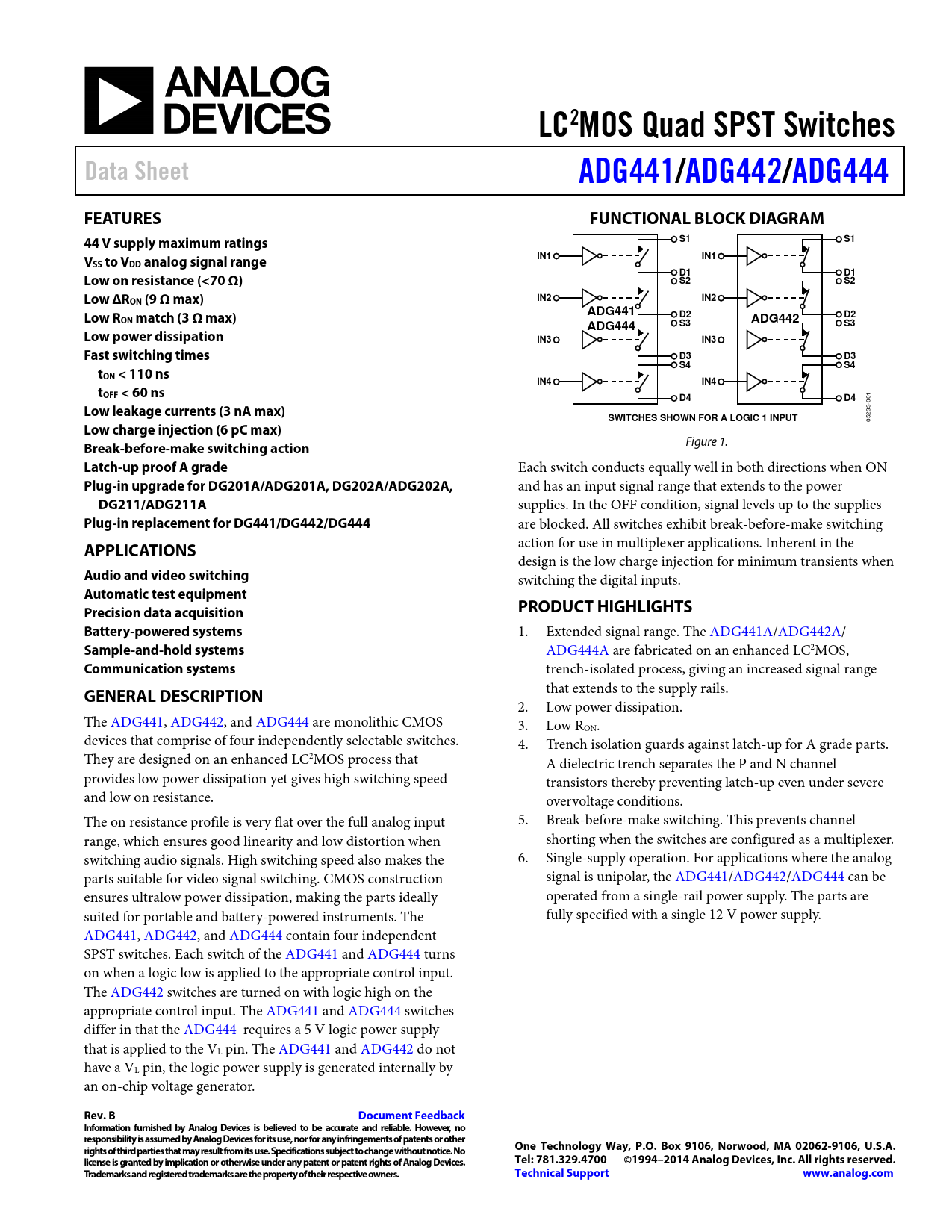 LC2MOS Quad SPST Switches. Data Sheet. ADG441/. ADG442/. ADG444. FEATURES. FUNCTIONAL BLOCK DIAGRAM. 44 V supply maximum ratings. IN1