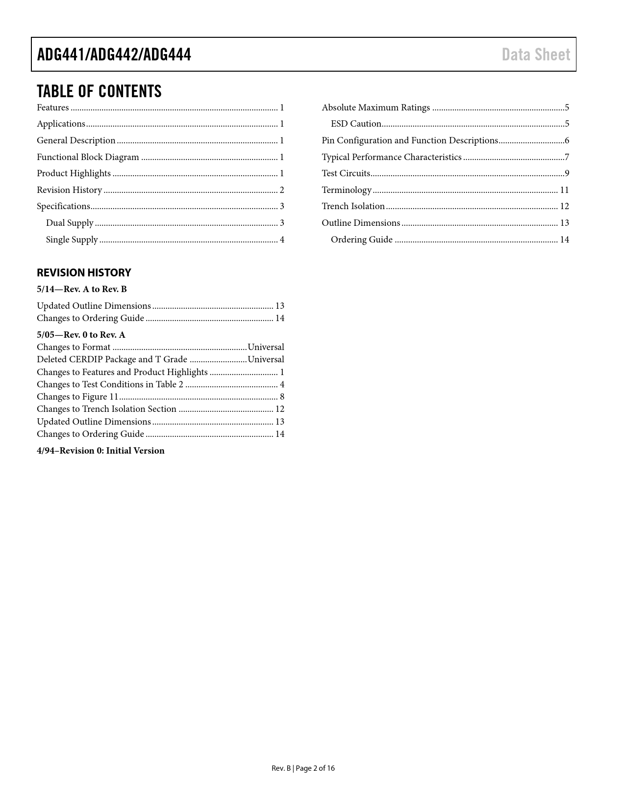 ADG441/ADG442/ADG444 Data Sheet TABLE OF CONTENTS REVISION HISTORY 5/14—Rev A to Rev B 5/05—Rev 0 to Rev A