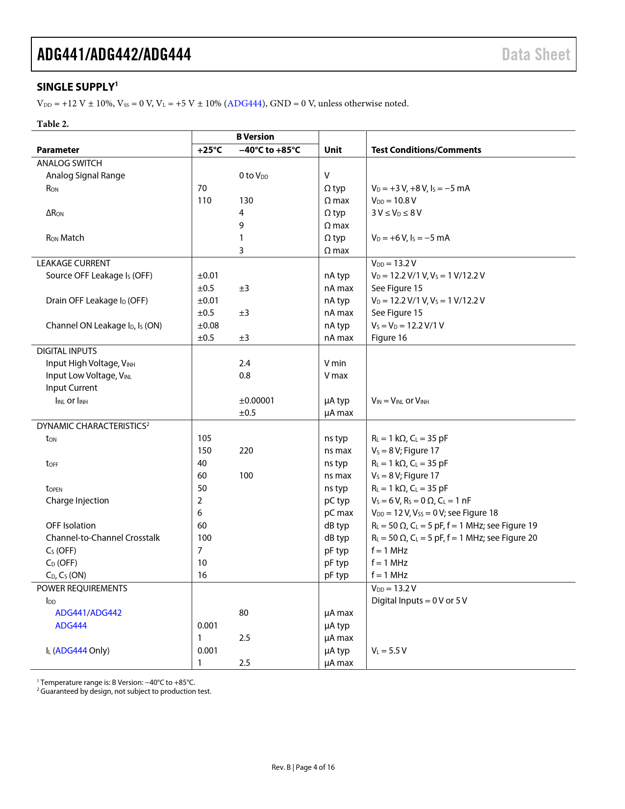 ADG441/ADG442/ADG444. Data Sheet. SINGLE SUPPLY1. Table 2. B Version. Parameter. +25°C. −40°C to +85°C. Unit. Test Conditions/Comments