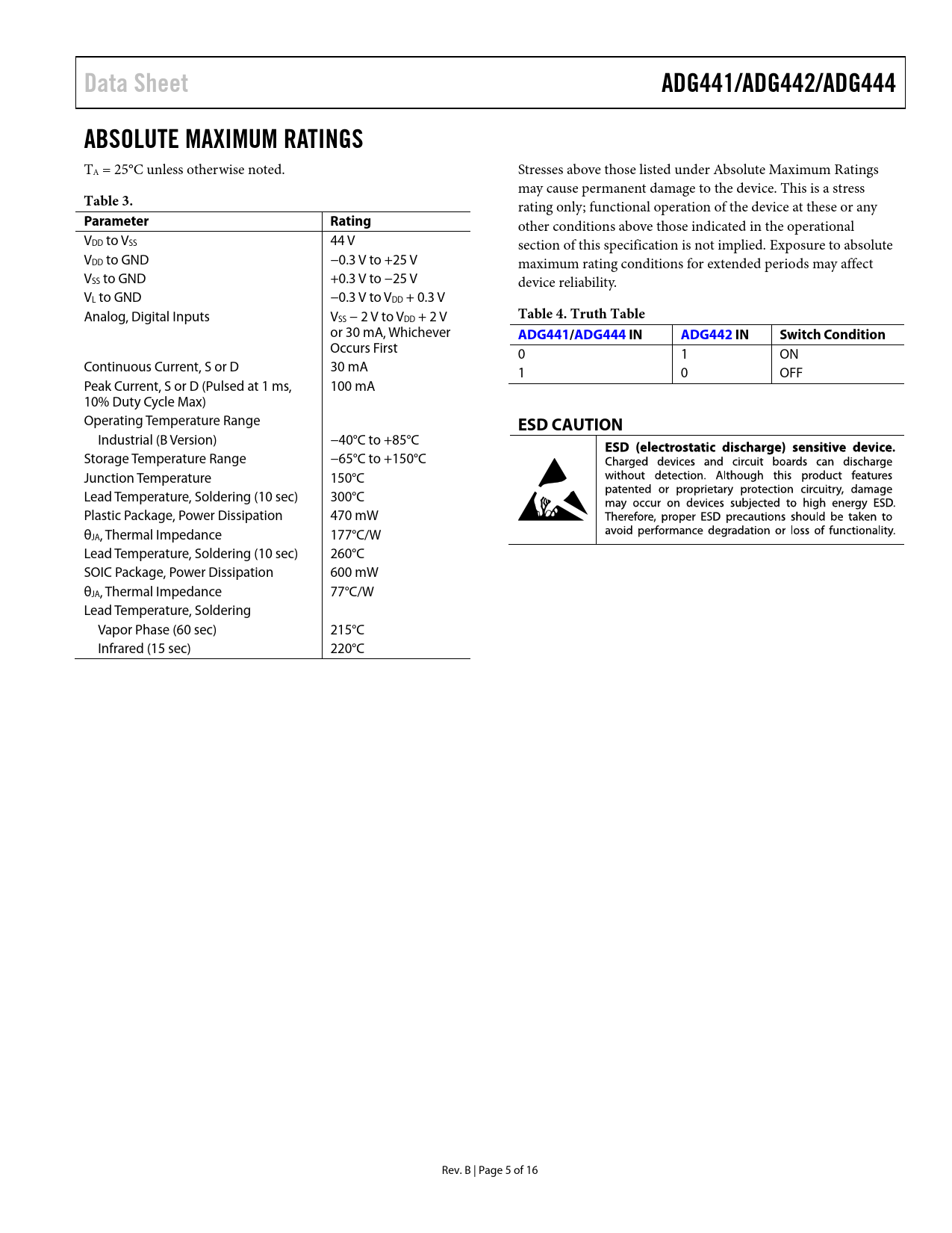 Data Sheet ADG441/ADG442/ADG444 ABSOLUTE MAXIMUM RATINGS Table 3 Parameter Rating Table 4 Truth Table ADG441/ ADG444 IN