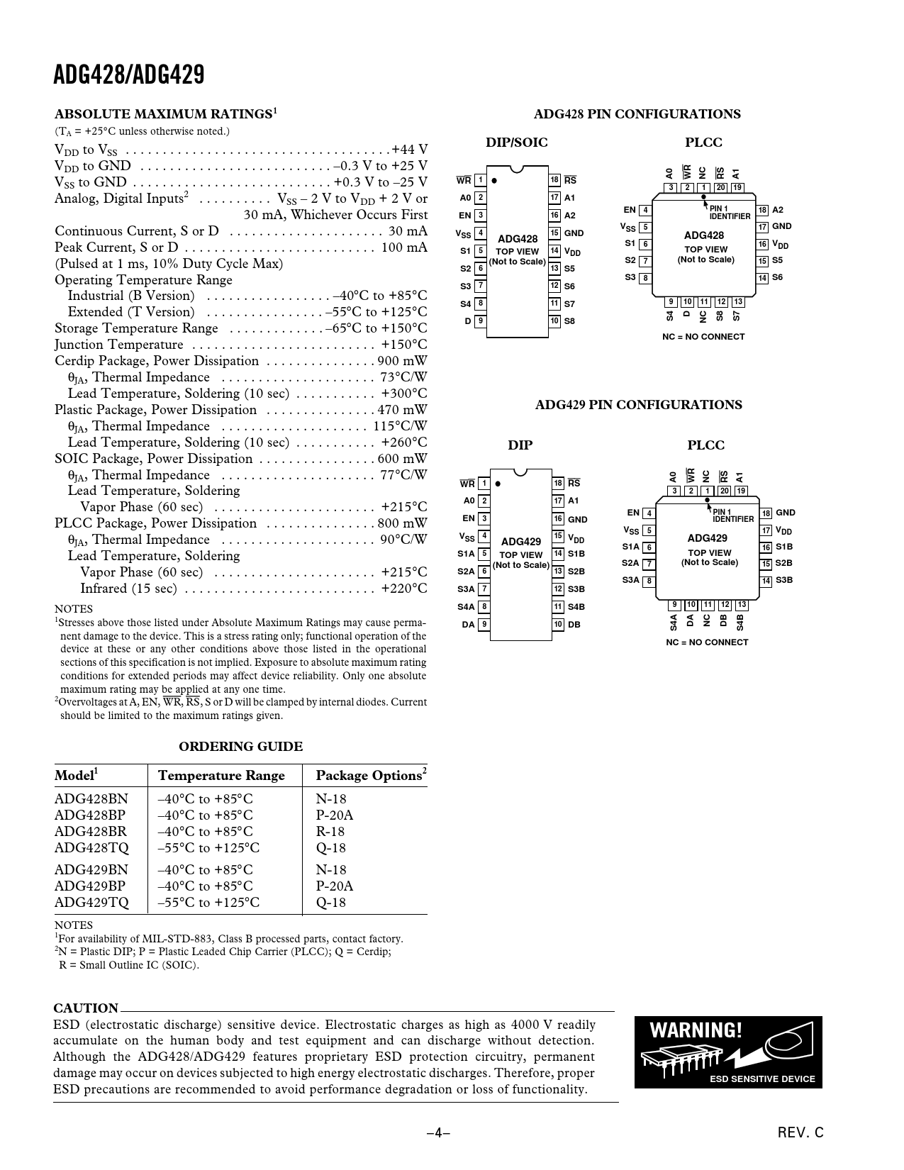 ADG428/ADG429 ABSOLUTE MAXIMUM RATINGS1 ADG428 PIN CONFIGURATIONS DIP/SOIC PLCC WR 1 18 RS 3 2 1 20 19 A0 2 17 A1 EN 4 PIN 1 18 A2