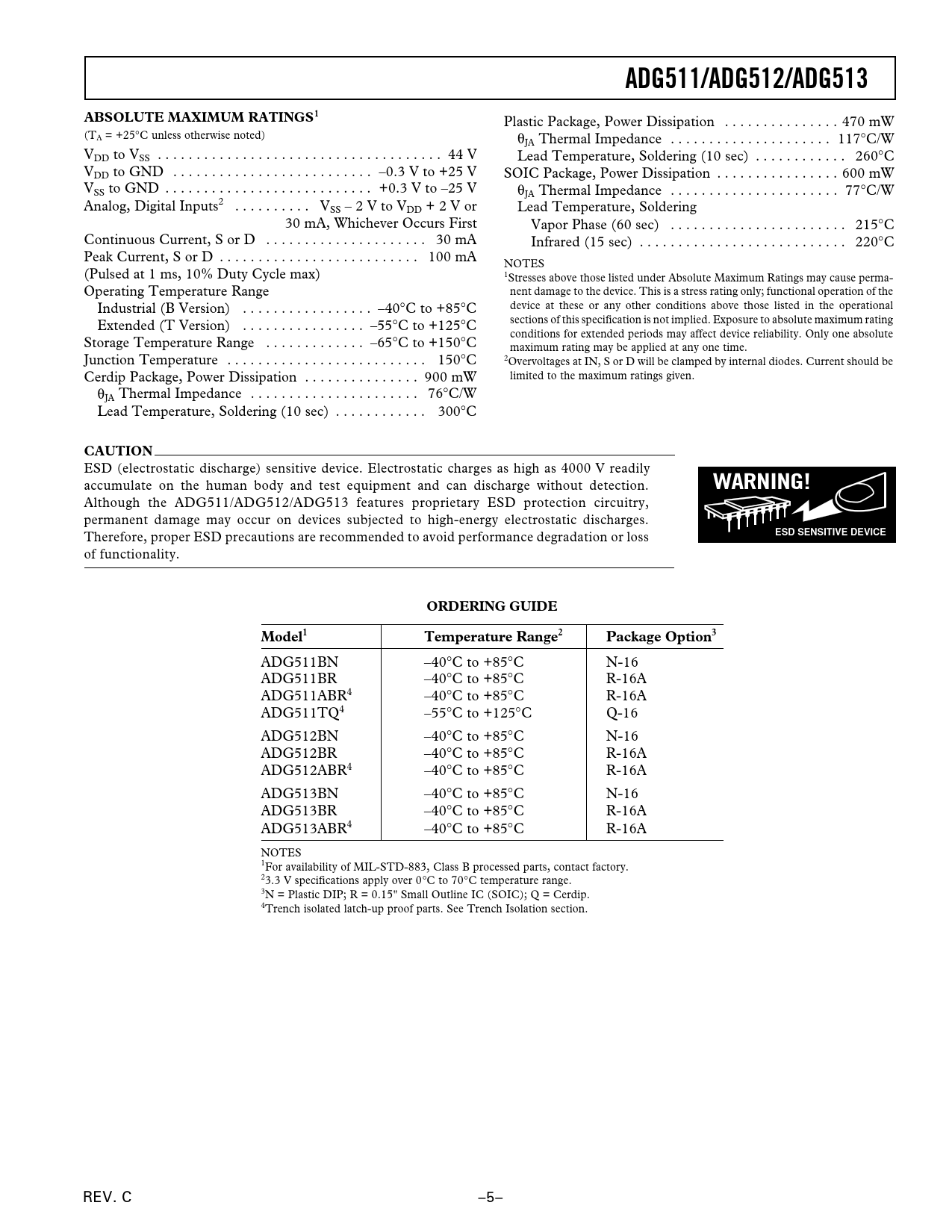 ADG511/ADG512/ADG513 ABSOLUTE MAXIMUM RATINGS1 CAUTION WARNING! ESD SENSITIVE DEVICE ORDERING GUIDE Model1 Temperature Range2