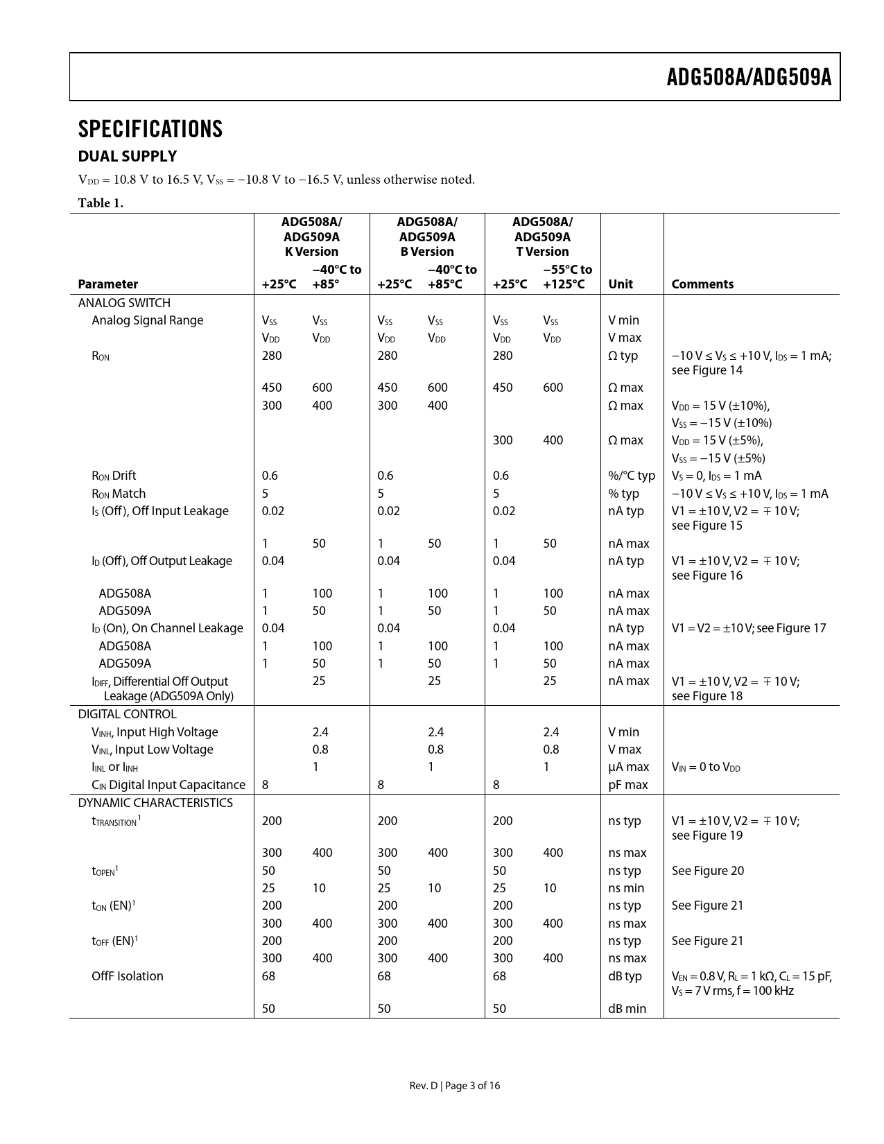 link to page 11 link to page 11 link to page 11 link to page 11 link to page 11 link to page 4 link to page 11 link to page 4 link to page 12 link to page 4 link to page 12 link to page 4 link to page 12 ADG508A/ADG509ASPECIFICATIONS DUAL SUPPLY VDD = 10.8 V to 16.5 V, VSS = −10.8 V to −16.5 V, unless otherwise noted. Table 1.ADG508A/ADG508A/ADG508A/ADG509AADG509AADG509AK VersionB VersionT Version−40°C to−40°C to−55°C toParameter+25°C+85°+25°C+85°C+25°C+125°CUnit Comments ANALOG SWITCH Analog Signal Range VSS VSS VSS VSS VSS VSS V min VDD VDD VDD VDD VDD VDD V max RON 280 280 280 Ω typ −10 V ≤ VS ≤ +10 V, IDS = 1 mA; see Figure 14 450 600 450 600 450 600 Ω max 300 400 300 400 Ω max VDD = 15 V (±10%), VSS = −15 V (±10%) 300 400 Ω max VDD = 15 V (±5%), VSS = −15 V (±5%) RON Drift 0.6 0.6 0.6 %/°C typ VS = 0, IDS = 1 mA RON Match 5 5 5 % typ −10 V ≤ VS ≤ +10 V, IDS = 1 mA IS (Off ), Off Input Leakage 0.02 0.02 0.02 nA typ V1 = ±10 V, V2 = m 10 V; see Figure 15 1 50 1 50 1 50 nA max ID (Off), Off Output Leakage 0.04 0.04 0.04 nA typ V1 = ±10 V, V2 = m 10 V; see Figure 16 ADG508A 1 100 1 100 1 100 nA max ADG509A 1 50 1 50 1 50 nA max ID (On), On Channel Leakage 0.04 0.04 0.04 nA typ V1 = V2 = ±10 V; see Figure 17 ADG508A 1 100 1 100 1 100 nA max ADG509A 1 50 1 50 1 50 nA max IDIFF, Differential Off Output 25 25 25 nA max V1 = ±10 V, V2 = m 10 V; Leakage (ADG509A Only) see Figure 18 DIGITAL CONTROL VINH, Input High Voltage 2.4 2.4 2.4 V min VINL, Input Low Voltage 0.8 0.8 0.8 V max IINL or IINH 1 1 1 μA max VIN = 0 to VDD CIN Digital Input Capacitance 8 8 8 pF max DYNAMIC CHARACTERISTICS t 1 TRANSITION 200 200 200 ns typ V1 = ±10 V, V2 = m 10 V; see Figure 19 300 400 300 400 300 400 ns max t 1 OPEN 50 50 50 ns typ See Figure 20 25 10 25 10 25 10 ns min tON (EN)1 200 200 200 ns typ See Figure 21 300 400 300 400 300 400 ns max tOFF (EN)1 200 200 200 ns typ See Figure 21 300 400 300 400 300 400 ns max OffF Isolation 68 68 68 dB typ VEN = 0.8 V, RL = 1 kΩ, CL = 15 pF, VS = 7 V rms, f = 100 kHz 50 50 50 dB min Rev. D | Page 3 of 16 Document Outline FEATURES FUNCTIONAL BLOCK DIAGRAMS GENERAL DESCRIPTION PRODUCT HIGHLIGHTS TABLE OF CONTENTS REVISION HISTORY SPECIFICATIONS DUAL SUPPLY SINGLE SUPPLY ABSOLUTE MAXIMUM RATINGS ESD CAUTION PIN CONFIGURATIONS AND FUNCTION DESCRIPTIONS TYPICAL PERFORMANCE CHARACTERISTICS TEST CIRCUITS SINGLE-SUPPLY OCTAL DAC APPLICATION OUTLINE DIMENSIONS ORDERING GUIDE