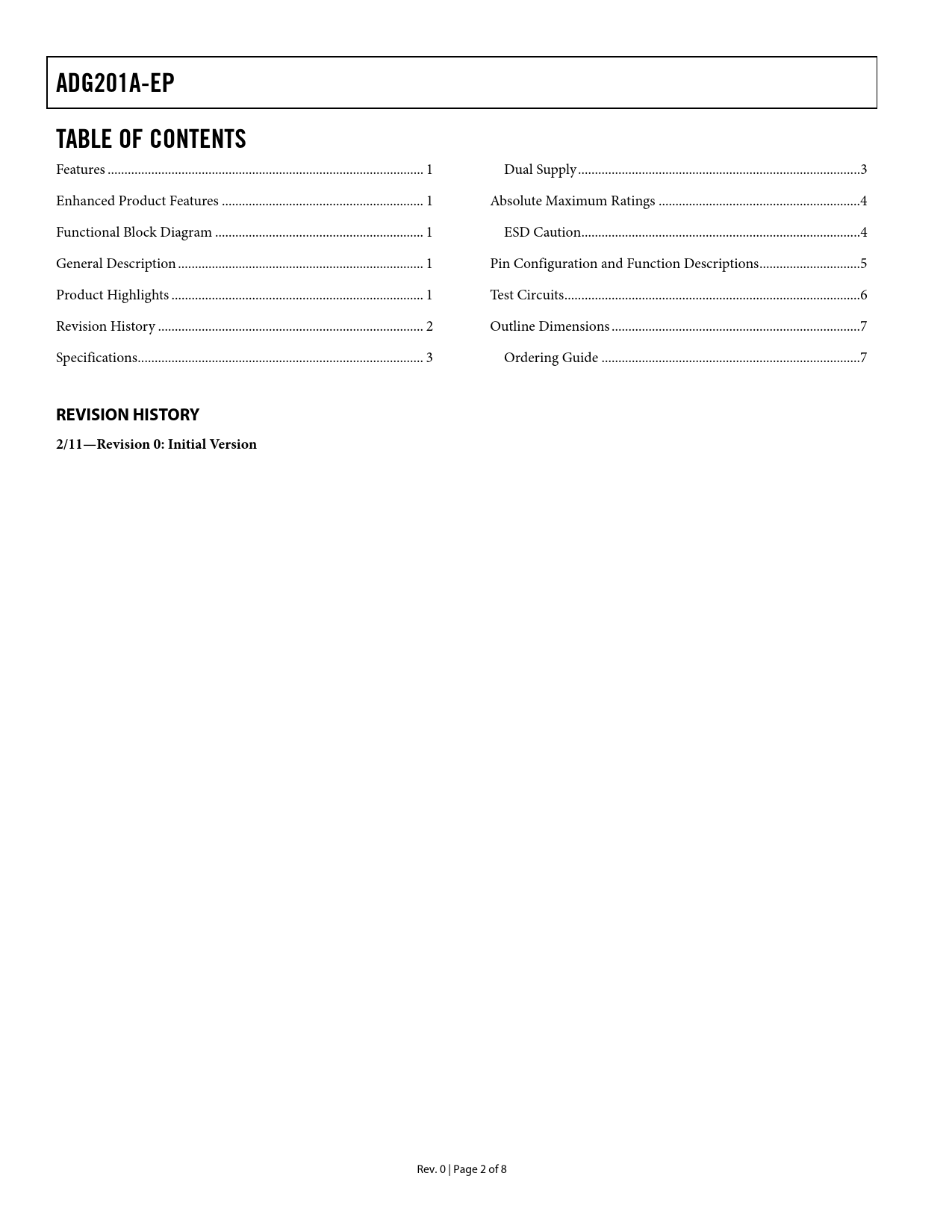Pages / Page8 / 2 — ADG201A-EP. TABLE OF CONTENTS. REVISION HISTORY. 2/11—Revision 0: Initial …