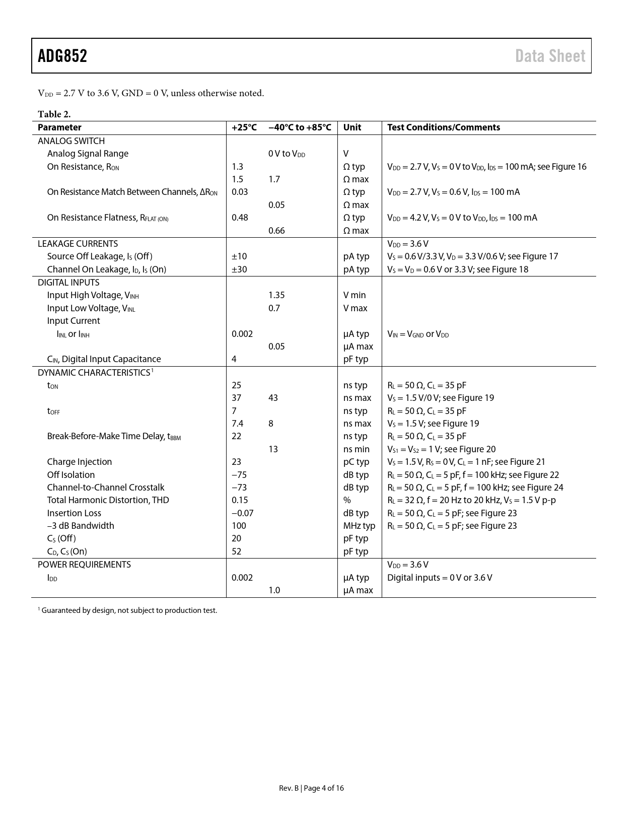 ADG852 Data Sheet Table 2 Parameter +25°C −40°C to +85°C Unit Test Conditions/Comments