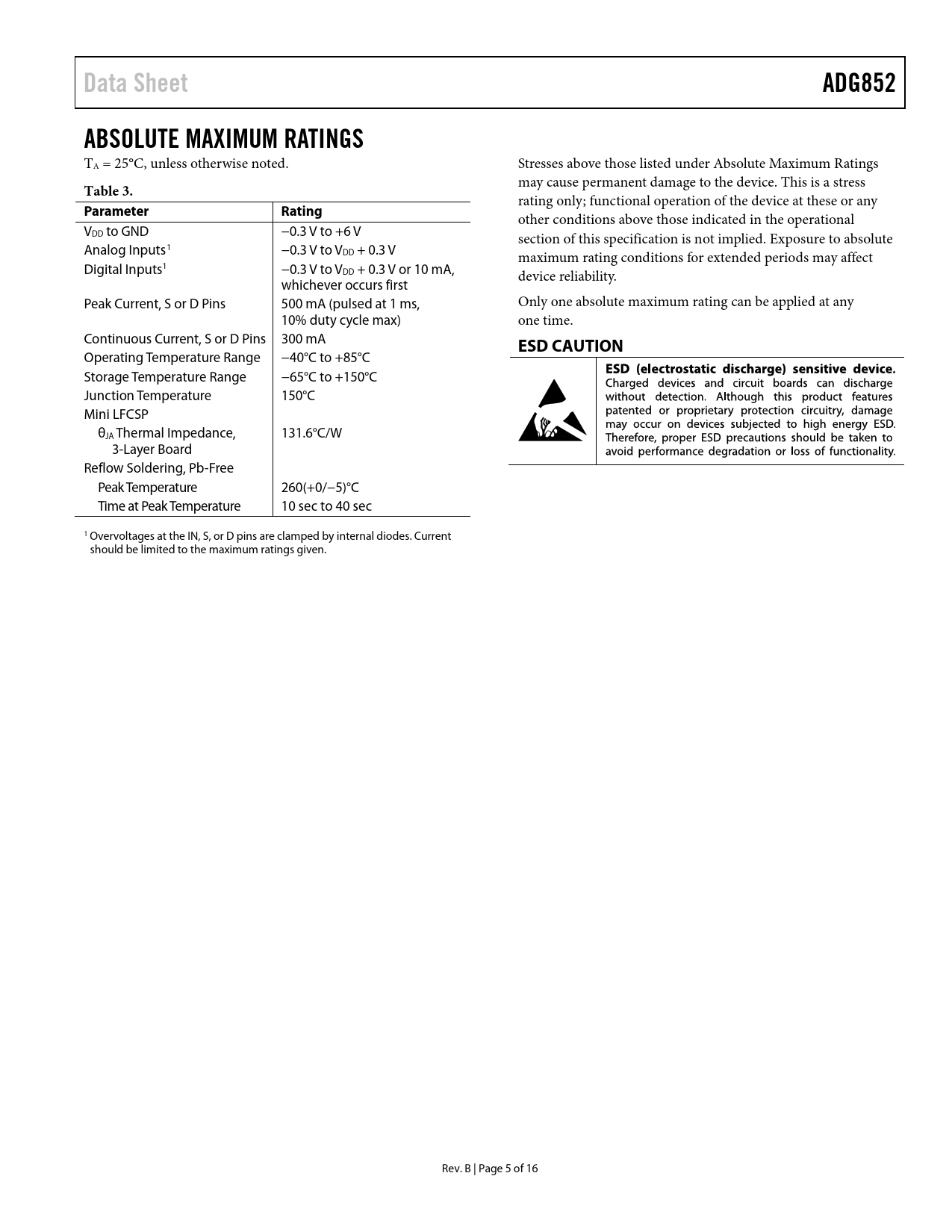 link to page 5 Data SheetADG852ABSOLUTE MAXIMUM RATINGS TA = 25°C, unless otherwise noted. Stresses above those listed under Absolute Maximum Ratings Table 3. may cause permanent damage to the device. This is a stress rating only; functional operation of the device at these or any ParameterRating other conditions above those indicated in the operational VDD to GND −0.3 V to +6 V section of this specification is not implied. Exposure to absolute Analog Inputs1 −0.3 V to VDD + 0.3 V maximum rating conditions for extended periods may affect Digital Inputs1 −0.3 V to VDD + 0.3 V or 10 mA, device reliability. whichever occurs first Peak Current, S or D Pins 500 mA (pulsed at 1 ms, Only one absolute maximum rating can be applied at any 10% duty cycle max) one time. Continuous Current, S or D Pins 300 mA ESD CAUTION Operating Temperature Range −40°C to +85°C Storage Temperature Range −65°C to +150°C Junction Temperature 150°C Mini LFCSP θJA Thermal Impedance, 131.6°C/W 3-Layer Board Reflow Soldering, Pb-Free Peak Temperature 260(+0/−5)°C Time at Peak Temperature 10 sec to 40 sec 1 Overvoltages at the IN, S, or D pins are clamped by internal diodes. Current should be limited to the maximum ratings given. Rev. B | Page 5 of 16 Document Outline Features Applications Functional Block Diagram General Description Product Highlights Revision History Specifications Absolute Maximum Ratings ESD Caution Pin Configuration and Function Description Typical Performance Characteristics Test Circuits Terminology Outline Dimensions Ordering Guide