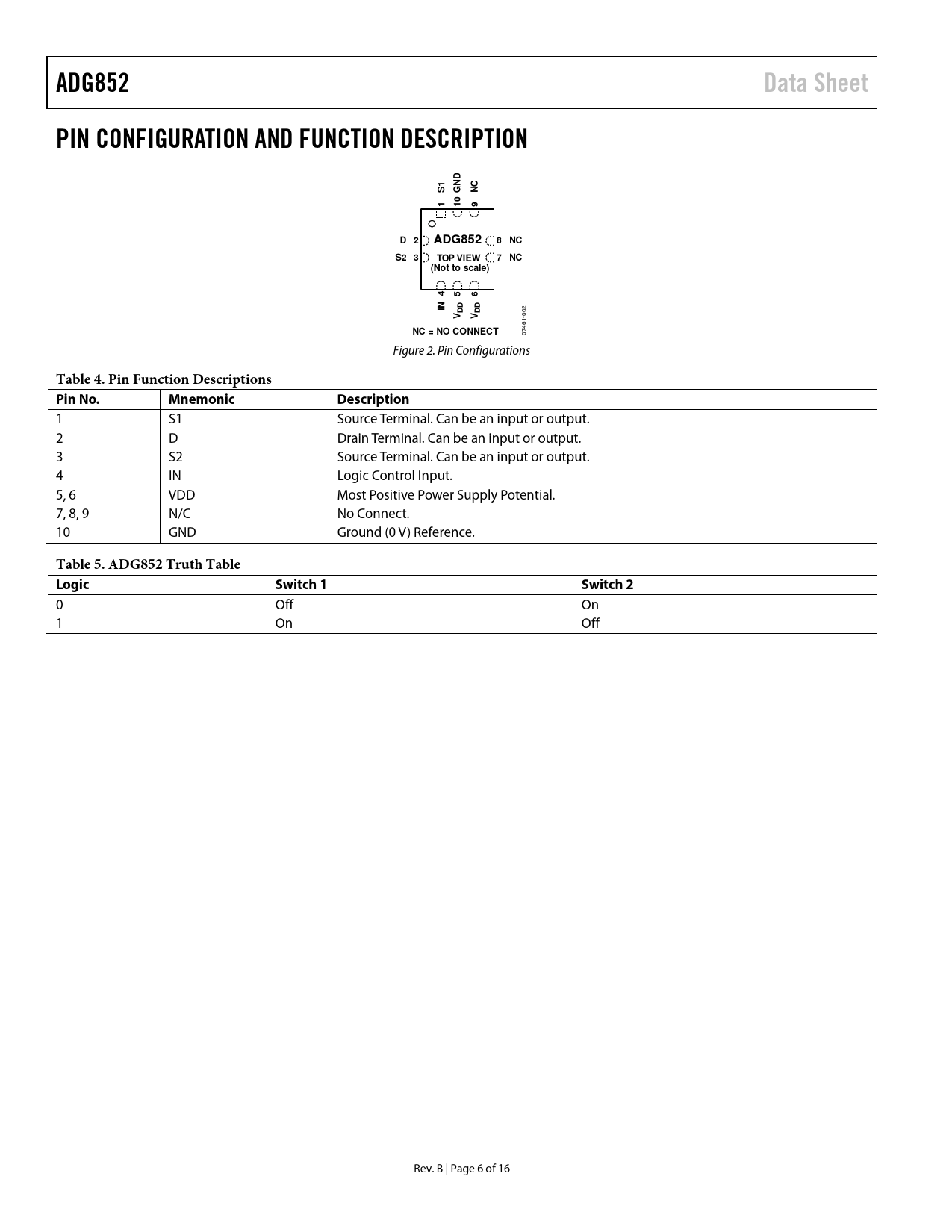 Pages / Page16 / 6 — ADG852. Data Sheet. PIN CONFIGURATION AND FUNCTION DESCRIPTION. D 2. 8 …