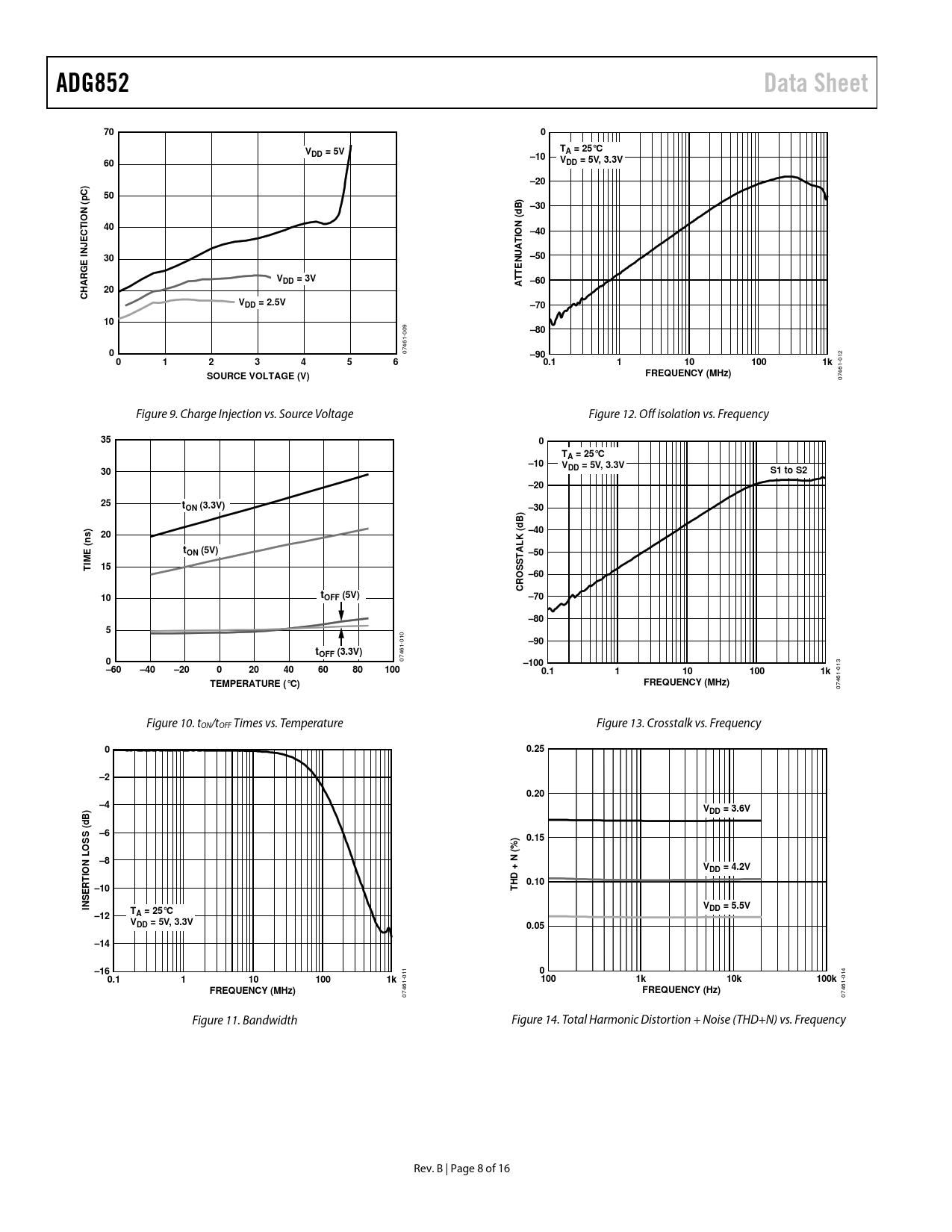 ADG852. Data Sheet. DD = 5V. A = 25°C. –10. VDD = 5V, 3.3V. –20. N (. –30. –40. NJE I. –50. NUAT E T. VDD = 3V. –60. CHARG. VDD = 2.5V. –70. –80. –90. 0.1. 100