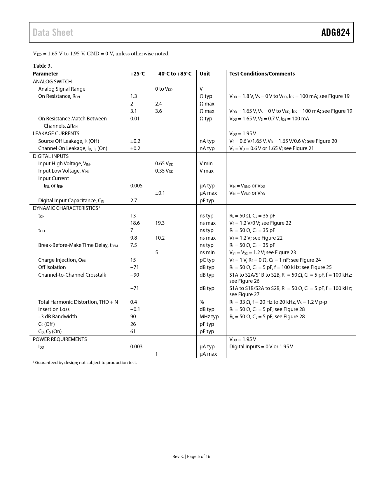 link to page 11 link to page 11 link to page 11 link to page 11 link to page 11 link to page 11 link to page 11 link to page 11 link to page 12 link to page 12 link to page 12 link to page 12 link to page 12 link to page 8 link to page 5 Data SheetADG824 VDD = 1.65 V to 1.95 V, GND = 0 V, unless otherwise noted. Table 3. Parameter+25°C−40°C to +85°CUnitTest Conditions/Comments ANALOG SWITCH Analog Signal Range 0 to VDD V On Resistance, RON 1.3 Ω typ VDD = 1.8 V, VS = 0 V to VDD, IDS = 100 mA; see Figure 19 2 2.4 Ω max 3.1 3.6 Ω max VDD = 1.65 V, VS = 0 V to VDD, IDS = 100 mA; see Figure 19 On Resistance Match Between 0.01 Ω typ VDD = 1.65 V, VS = 0.7 V, IDS = 100 mA Channels, ∆RON LEAKAGE CURRENTS VDD = 1.95 V Source Off Leakage, IS (Off) ±0.2 nA typ VS = 0.6 V/1.65 V, VD = 1.65 V/0.6 V; see Figure 20 Channel On Leakage, ID, IS (On) ±0.2 nA typ VS = VD = 0.6 V or 1.65 V; see Figure 21 DIGITAL INPUTS Input High Voltage, VINH 0.65 VDD V min Input Low Voltage, VINL 0.35 VDD V max Input Current IINL or IINH 0.005 µA typ VIN = VGND or VDD ±0.1 µA max VIN = VGND or VDD Digital Input Capacitance, CIN 2.7 pF typ DYNAMIC CHARACTERISTICS1 tON 13 ns typ RL = 50 Ω, CL = 35 pF 18.6 19.3 ns max VS = 1.2 V/0 V; see Figure 22 tOFF 7 ns typ RL = 50 Ω, CL = 35 pF 9.8 10.2 ns max VS = 1.2 V; see Figure 22 Break-Before-Make Time Delay, tBBM 7.5 ns typ RL = 50 Ω, CL = 35 pF 5 ns min VS1 = VS2 = 1.2 V; see Figure 23 Charge Injection, QINJ 15 pC typ VS = 1 V, RS = 0 Ω, CL = 1 nF; see Figure 24 Off Isolation −71 dB typ RL = 50 Ω, CL = 5 pF, f = 100 kHz; see Figure 25 Channel-to-Channel Crosstalk −90 dB typ S1A to S2A/S1B to S2B, RL = 50 Ω, CL = 5 pF, f = 100 kHz; see Figure 26 −71 dB typ S1A to S1B/S2A to S2B, RL = 50 Ω, CL = 5 pF, f = 100 kHz; see Figure 27 Total Harmonic Distortion, THD + N 0.4 % RL = 33 Ω, f = 20 Hz to 20 kHz, VS = 1.2 V p-p Insertion Loss −0.1 dB typ RL = 50 Ω, CL = 5 pF; see Figure 28 –3 dB Bandwidth 90 MHz typ RL = 50 Ω, CL = 5 pF; see Figure 28 CS (Off) 26 pF typ CD, CS (On) 61 pF typ POWER REQUIREMENTS VDD = 1.95 V IDD 0.003 µA typ Digital inputs = 0 V or 1.95 V 1 µA max 1 Guaranteed by design; not subject to production test. Rev. C | Page 5 of 16 Document Outline Features Applications Functional Block Diagram General Description Product Highlights Revision History Specifications Absolute Maximum Ratings ESD Caution Pin Configuration and Function Descriptions Typical Performance Characteristics Test Circuits Terminology Outline Dimensions Ordering Guide