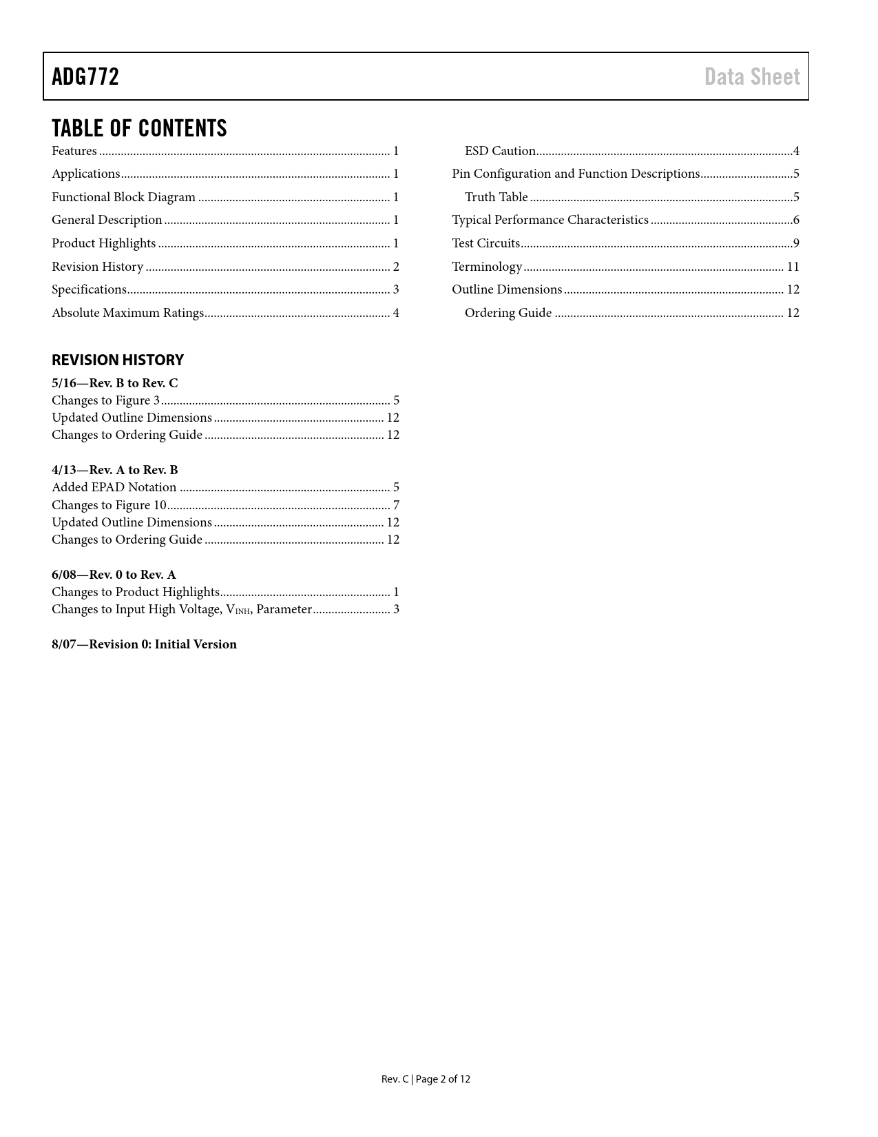 Pages / Page12 / 2 — ADG772. Data Sheet. TABLE OF CONTENTS. REVISION HISTORY. 5/16—Rev. B to …