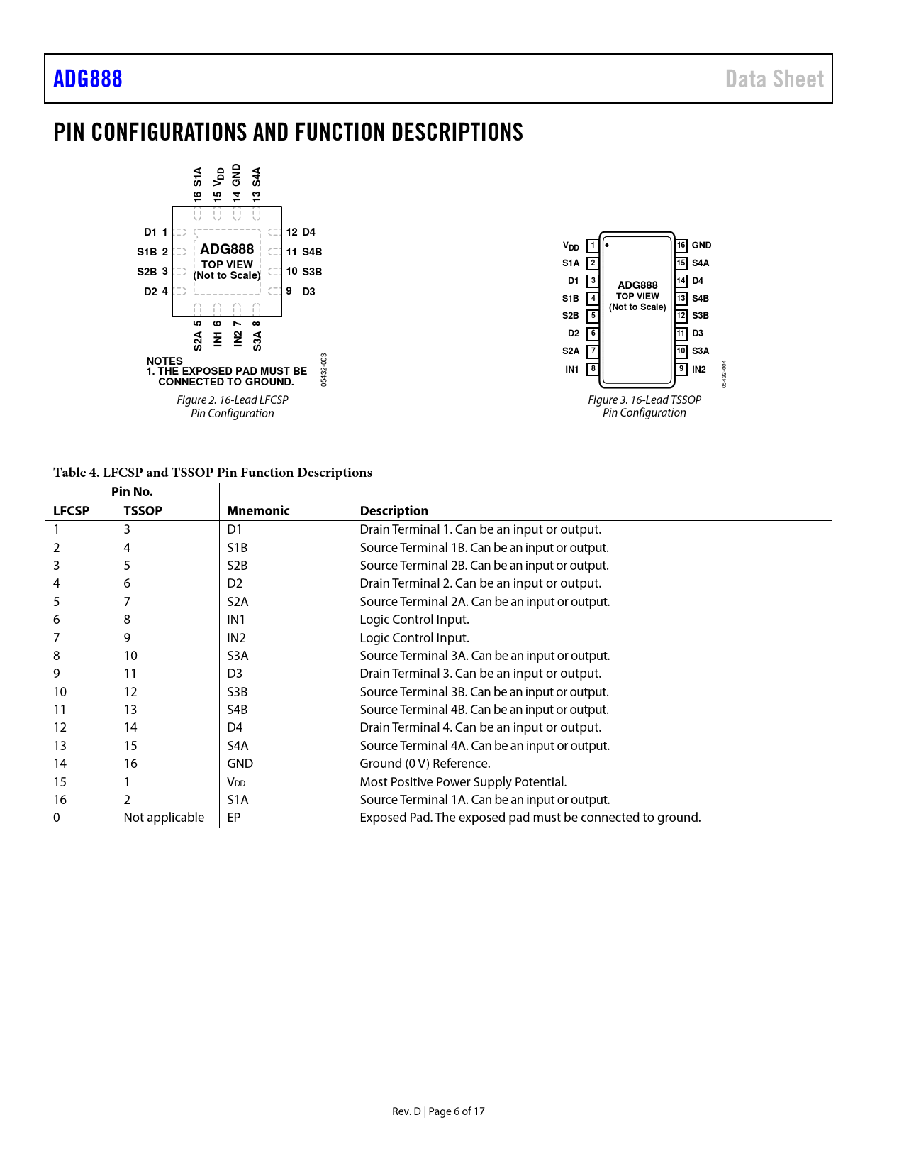 ADG888Data SheetPIN CONFIGURATIONS AND FUNCTION DESCRIPTIONSDAADDS1VGNS465431111D1 112 D4V116 GNDS1B 2ADG88811 S4BDDTOP VIEWS1A215S4AS2B 310 S3B(Not to Scale)D1314D4ADG888D2 49D3S1B4TOP VIEW13S4B(Not to Scale)S2B512S3B5678A12AD2611D3S2ININS3S2A710S3A 3 NOTES 4 -00 0 1. THE EXPOSED PAD MUST BE8IN19IN2 0 2- 5432 CONNECTED TO GROUND. 43 0 05 Figure 2. 16-Lead LFCSP Figure 3. 16-Lead TSSOP Pin Configuration Pin Configuration Table 4. LFCSP and TSSOP Pin Function DescriptionsPin No.LFCSP TSSOPMnemonic Description 1 3 D1 Drain Terminal 1. Can be an input or output. 2 4 S1B Source Terminal 1B. Can be an input or output. 3 5 S2B Source Terminal 2B. Can be an input or output. 4 6 D2 Drain Terminal 2. Can be an input or output. 5 7 S2A Source Terminal 2A. Can be an input or output. 6 8 IN1 Logic Control Input. 7 9 IN2 Logic Control Input. 8 10 S3A Source Terminal 3A. Can be an input or output. 9 11 D3 Drain Terminal 3. Can be an input or output. 10 12 S3B Source Terminal 3B. Can be an input or output. 11 13 S4B Source Terminal 4B. Can be an input or output. 12 14 D4 Drain Terminal 4. Can be an input or output. 13 15 S4A Source Terminal 4A. Can be an input or output. 14 16 GND Ground (0 V) Reference. 15 1 VDD Most Positive Power Supply Potential. 16 2 S1A Source Terminal 1A. Can be an input or output. 0 Not applicable EP Exposed Pad. The exposed pad must be connected to ground. Rev. D | Page 6 of 17 Document Outline Features Applications Functional Block Diagram General Description Product Highlights Revision History Specifications Absolute Maximum Ratings ESD Caution Pin Configurations and Function Descriptions Typical Performance Characteristics Test Circuits Terminology Outline Dimensions Ordering Guide