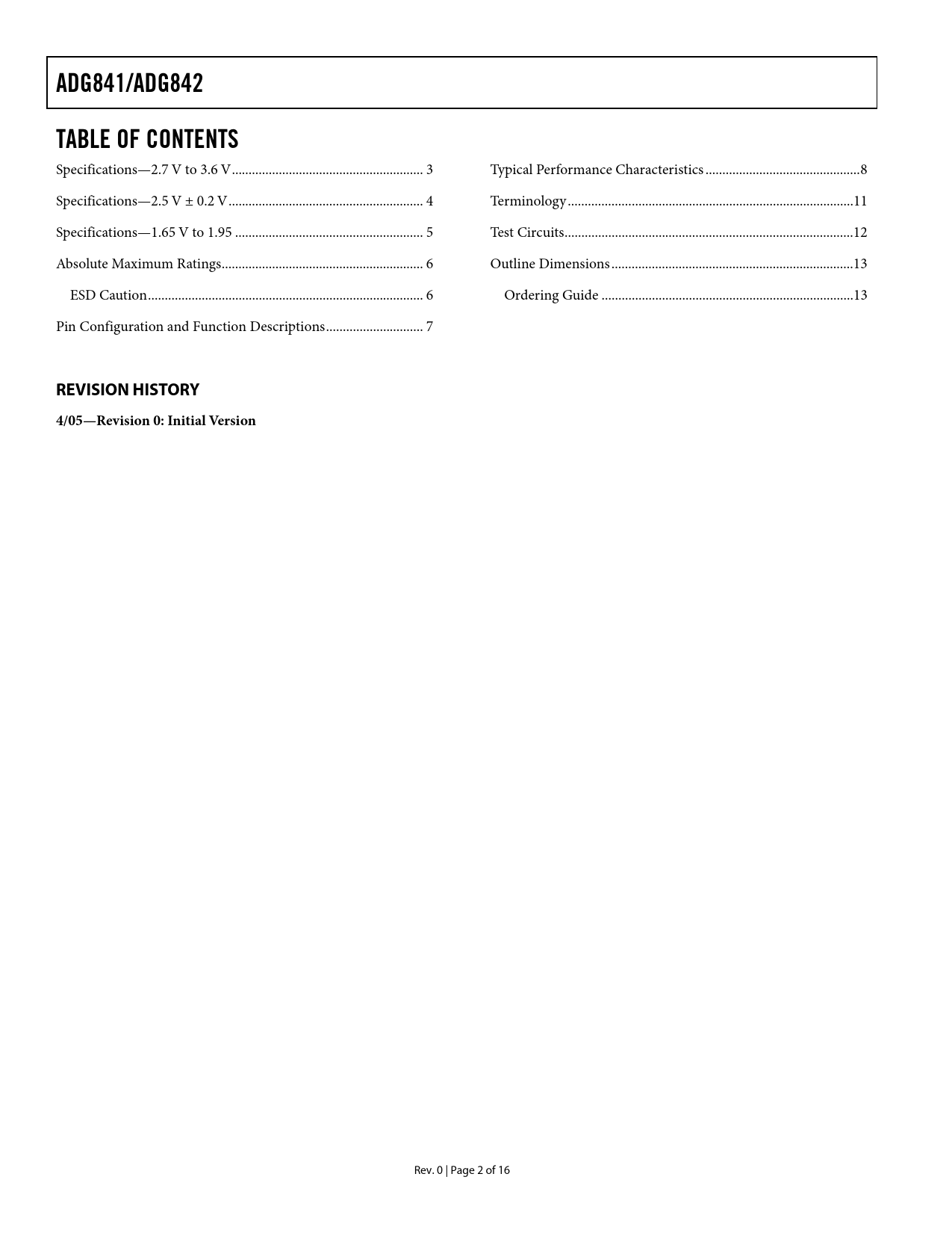 Pages / Page16 / 2 — ADG841/ADG842. TABLE OF CONTENTS. REVISION HISTORY. 4/05—Revision 0: …