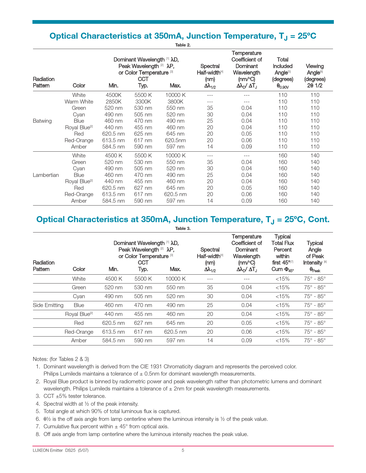 Temperature Dominant Wavelength [1] λD, Coefficient of Total Peak Wavelength [2] λP, Spectral Dominant Included Viewing or Color Temperature [3] Halfwidth[4] Wavelength Angle[5] Angle[6] Radiation CCT (nm) (nm/oC) (degrees) (degrees) Pattern Color Min. Typ. Max. Δλ Δλ / ΔT θ 2θ 1/2 1/2 D J 0.90V White 4500K 5500 K 10000 K 110 110 Warm White 2850K 3300K 3800K 110 110 Green 520 nm 530 nm 550 nm 35 0.04 110 110 Cyan 490 nm 505 nm 520 nm 30 0.04 110 110 Batwing Blue 460 nm 470 nm 490 nm 25 0.04 110 110 Royal Blue[2] 440 nm 455 nm 460 nm 20 0.04 110 110 Red 620.5 nm 625 nm 645 nm 20 0.05 110 110 RedOrange 613.5 nm 617 nm 620.5nm 20 0.06 110 110 Amber 584.5 nm 590 nm 597 nm 14 0.09 110 110 White 4500 K 5500 K 10000 K 160 140 Green 520 nm 530 nm 550 nm 35 0.04 160 140 Cyan 490 nm 505 nm 520 nm 30 0.04 160 140 Lambertian Blue 460 nm 470 nm 490 nm 25 0.04 160 140 Royal Blue[2] 440 nm 455 nm 460 nm 20 0.04 160 140 Red 620.5 nm 627 nm 645 nm 20 0.05 160 140 RedOrange 613.5 nm 617 nm 620.5 nm 20 0.06 160 140 Amber 584.5 nm 590 nm 597 nm 14 0.09 160 140
