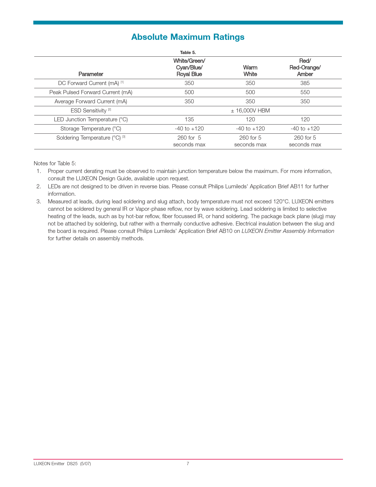 White/Green/ Red/ Cyan/Blue/ Warm RedOrange/ Parameter Royal Blue White Amber DC Forward Current (mA) [1] 350 350 385 Peak Pulsed Forward Current (mA) 500 500 550 Average Forward Current (mA) 350 350 350 ESD Sensitivity [2] ± 16,000V HBM LED Junction Temperature (°C) 135 120 120 Storage Temperature (°C) 40 to +120 40 to +120 40 to +120 Soldering Temperature (°C) [3] 260 for 5 260 for 5 260 for 5 seconds max seconds max seconds max Notes for Table 5: 1. Proper current derating must be observed to maintain junction temperature below the maximum. For more information, consult the LUXEON Design Guide, available upon request. 2. LEDs are not designed to be driven in reverse bias. Please consult Philips Lumileds' Application Brief AB11 for further information. 3. Measured at leads, during lead soldering and slug attach, body temperature must not exceed 120°C. LUXEON emitters cannot be soldered by general IR or Vaporphase reflow, nor by wave soldering. Lead soldering is limited to selective heating of the leads, such as by hotbar reflow, fiber focussed IR, or hand soldering. The package back plane (slug) may not be attached by soldering, but rather with a thermally conductive adhesive. Electrical insulation between the slug and the board is required. Please consult Philips Lumileds' Application Brief AB10 on LUXEON Emitter Assembly Information for further details on assembly methods. LUXEON Emitter DS25 (5/07) 7