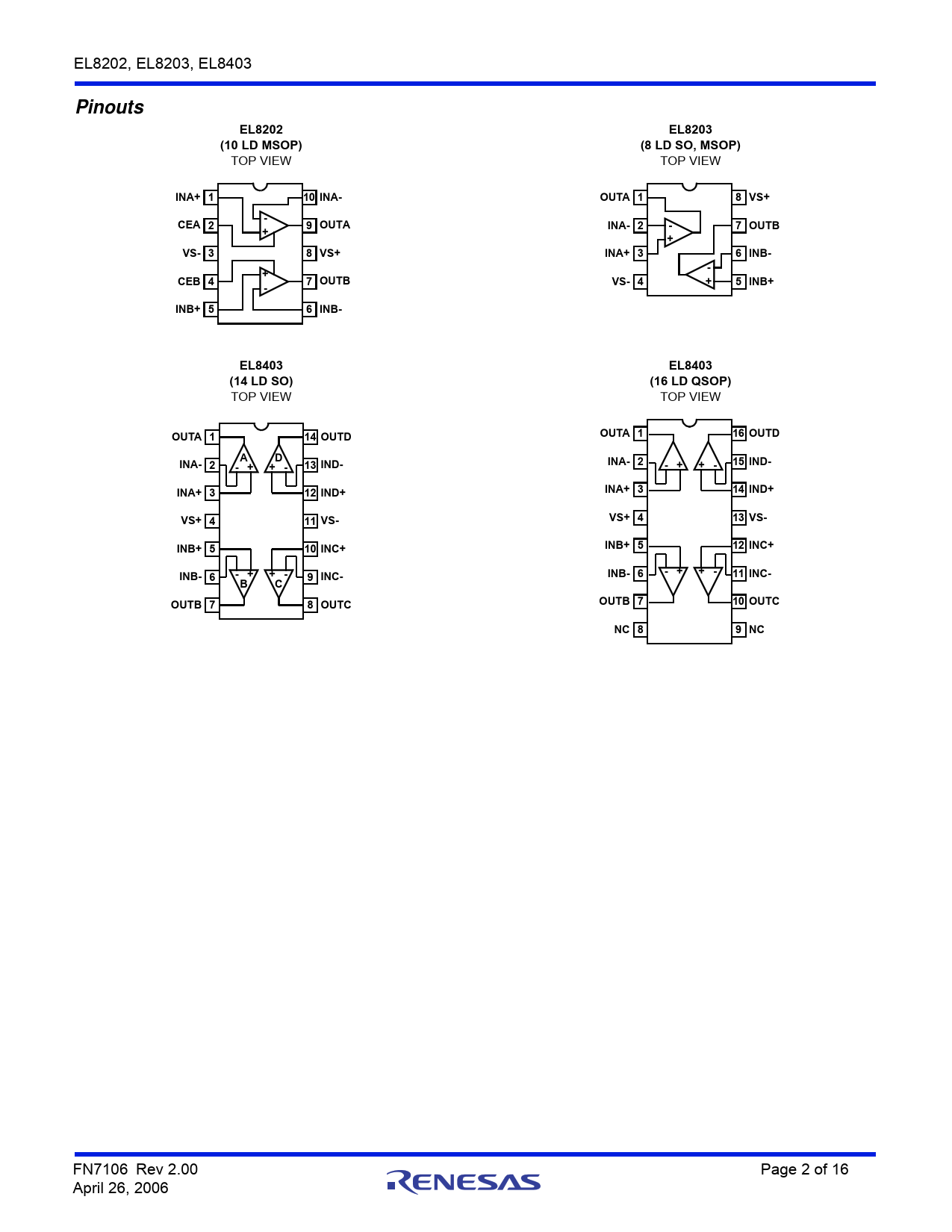 INA+ 1 10 INA- OUTA 1 8 VS+ - CEA 2 9 OUTA INA- 2 - 7 OUTB + + VS- 3 8 VS+ INA+ 3 6 INB- - + CEB 4 7 OUTB VS- 4 + 5 INB+ - INB+ 5 6 INB- EL8403 EL8403 (14 LD SO) (16 LD QSOP)