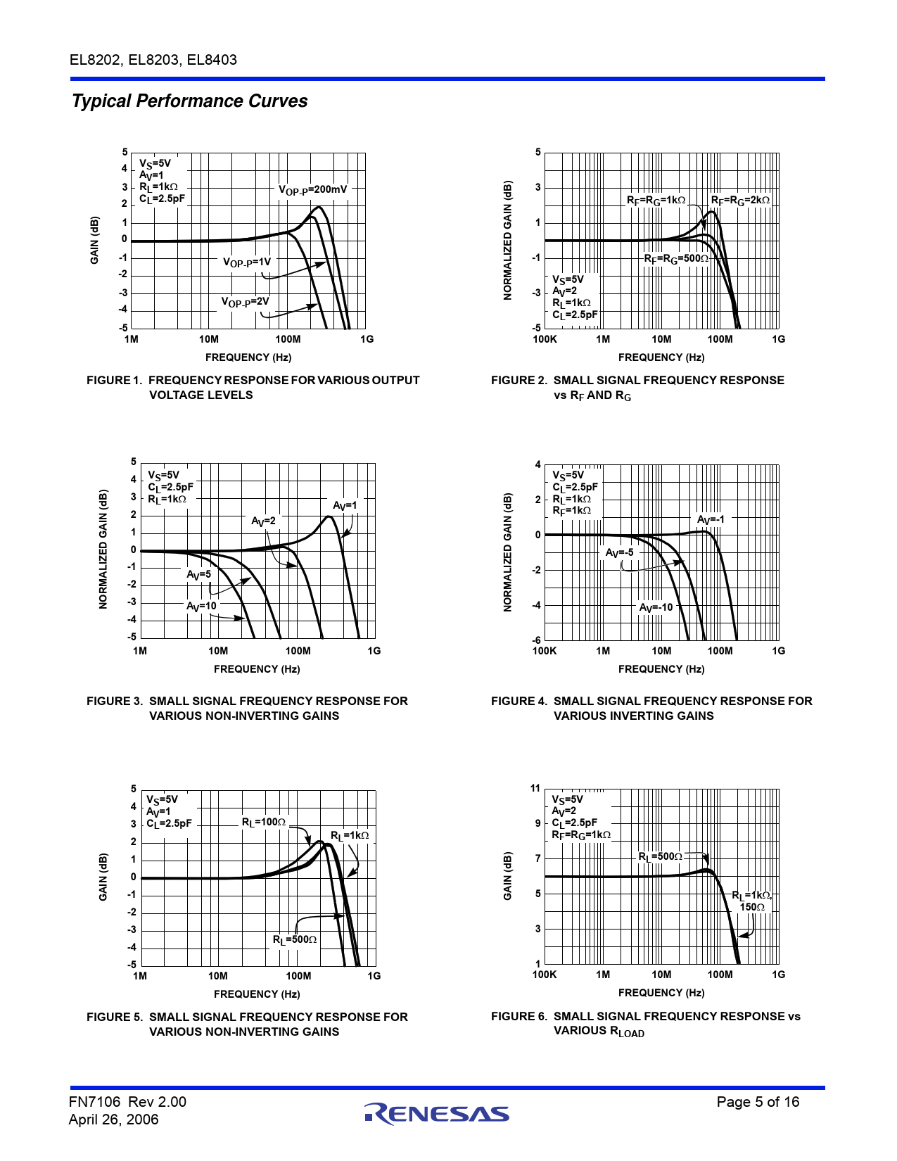 EL8202, EL8203, EL8403 Typical Performance Curves55VS=5V4AV=13RL=1kVOP-P=200mVB)3CdL=2.5pF2RRF=RG=1kF=RG=2k11dB) ( N0-1GAIV-1ROP-P=1VF=RG=500-2VS=5V-3-3AV=2VNORMALIZED GAIN (R-4OP-P=2VL=1kCL=2.5pF-5-51M10M100M1G100K1M10M100M1GFREQUENCY (Hz)FREQUENCY (Hz)FIGURE 1. FREQUENCY RESPONSE FOR VARIOUS OUTPUTFIGURE 2. SMALL SIGNAL FREQUENCY RESPONSEVOLTAGE LEVELSvs RF AND RG54V4S=5VVS=5VCL=2.5pFCL=2.5pFB)3dRL=1k2RAL=1kV=12RF=1kAV=2AV=-1100AV=-5-1A-2V=5-2-3NORMALIZED GAIN (AV=10-4NORMALIZED GAIN (dB)AV=-10-4-5-61M10M100M1G100K1M10M100M1GFREQUENCY (Hz)FREQUENCY (Hz)FIGURE 3. SMALL SIGNAL FREQUENCY RESPONSE FORFIGURE 4. SMALL SIGNAL FREQUENCY RESPONSE FORVARIOUS NON-INVERTING GAINSVARIOUS INVERTING GAINS511VS=5VV4S=5VAV=1AV=23 CL=2.5pFRL=1009 CL=2.5pFRL=1kR2F=RG=1k17RL=500dB)dB)((N0N-1GAI5GAIRL=1k,-2150-33R-4L=500-511M10M100M1G100K1M10M100M1GFREQUENCY (Hz)FREQUENCY (Hz)FIGURE 5. SMALL SIGNAL FREQUENCY RESPONSE FORFIGURE 6. SMALL SIGNAL FREQUENCY RESPONSE vsVARIOUS NON-INVERTING GAINSVARIOUS RLOAD FN7106 Rev 2.00 Page 5 of 16 April 26, 2006