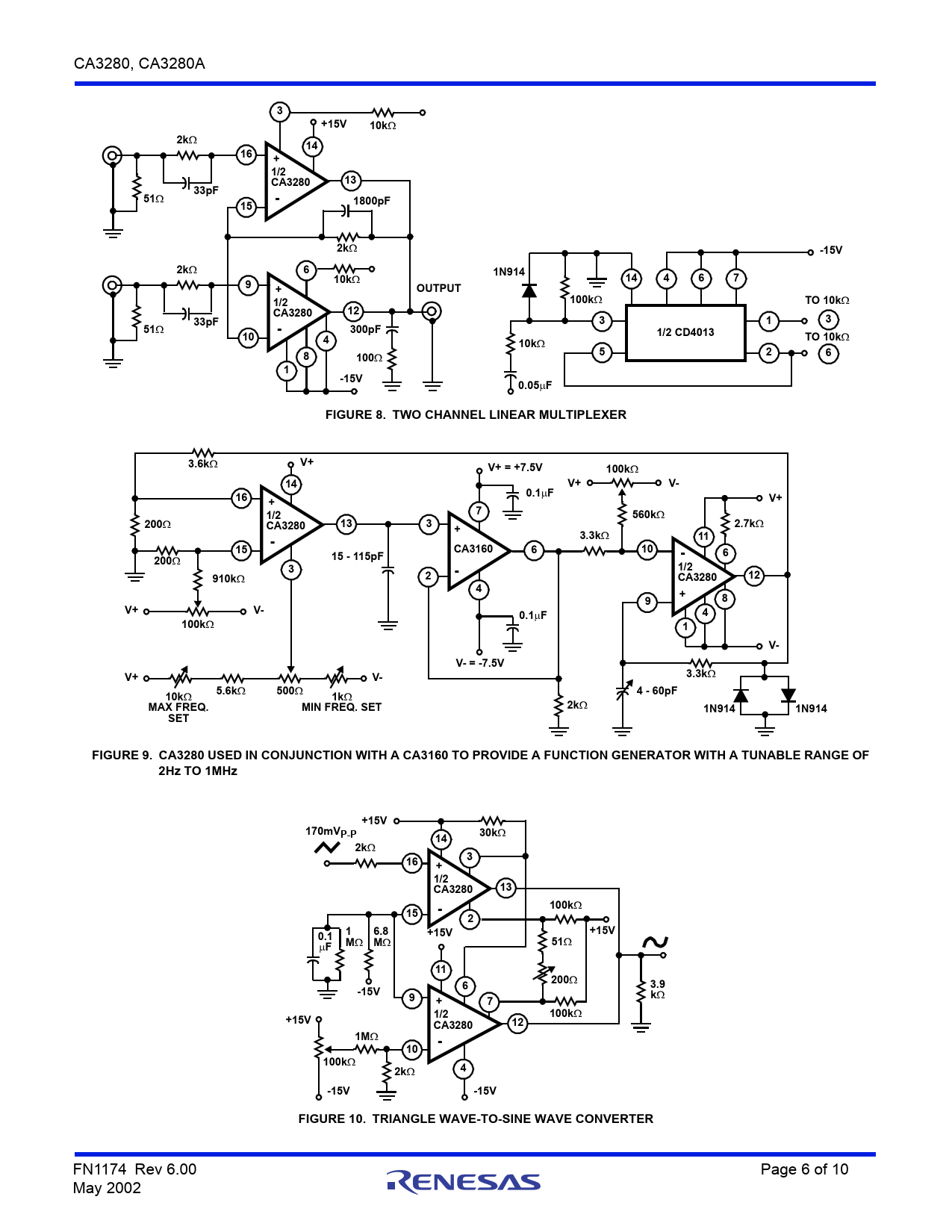 F 100k 1 V- V- = -7.5V 3.3k V+ V- 5.6k 500 4 - 60pF 10k 1k 2k MAX FREQ. MIN FREQ. SET 1N914 1N914 SET FIGURE 9. CA3280 USED IN CONJUNCTION WITH A CA3160 TO PROVIDE A FUNCTION GENERATOR WITH A TUNABLE RANGE OF 2Hz TO 1MHz +15V 170mVP-P 30k 14 2k 3 16 + 1/2 13 CA3280 100k 15 - 2 0.1 1 6.8 +15V +15V