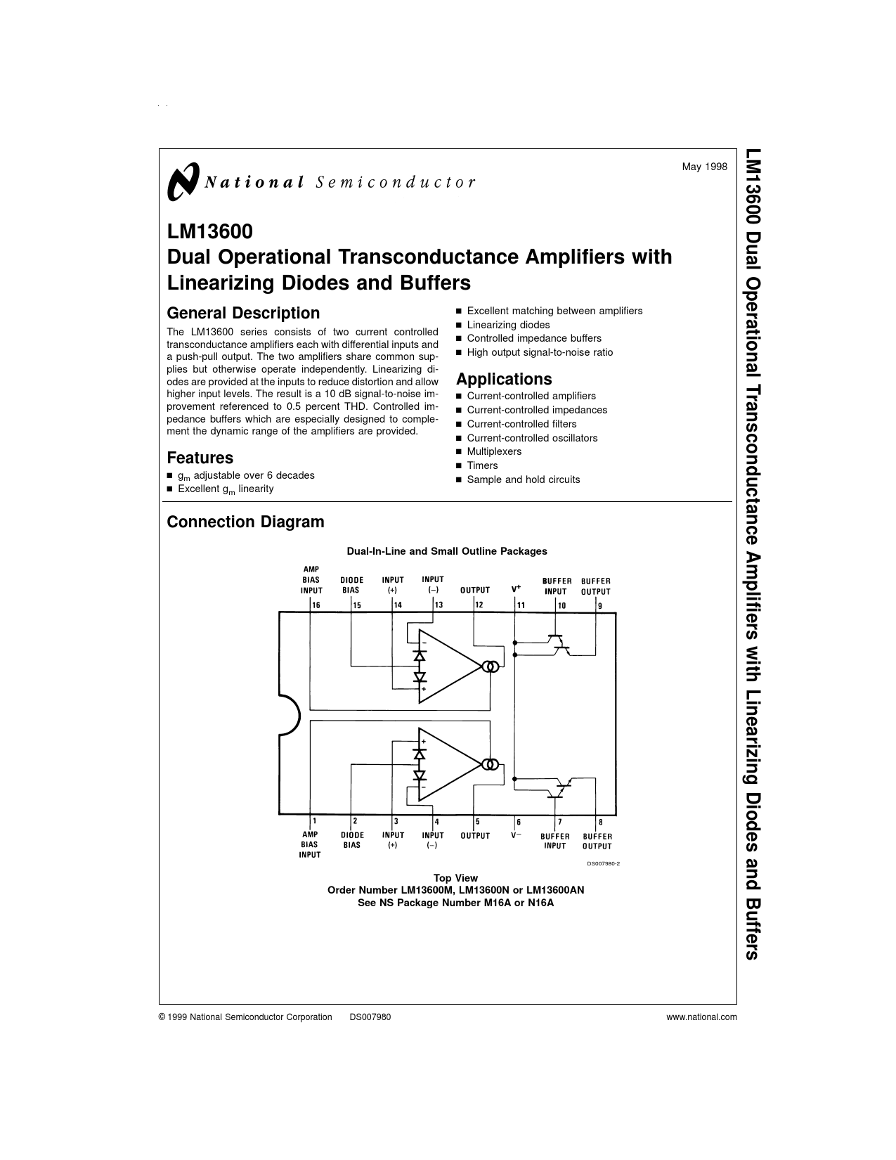 LM13600. Dual. Dual Operational Transconductance Amplifiers with. Operational. Linearizing Diodes and Buffers