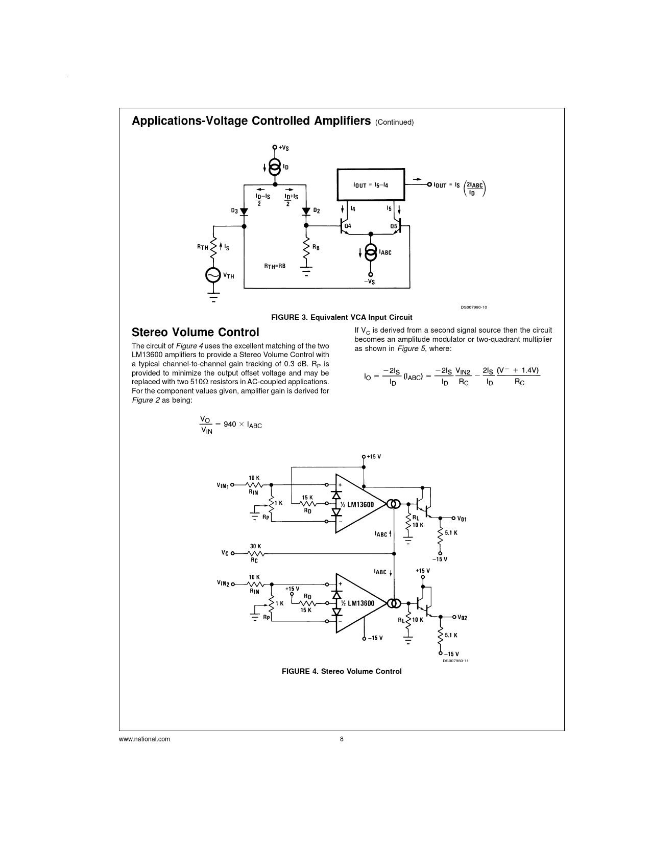 Applications-Voltage Controlled Amplifiers (Continued) DS007980-10 FIGURE 3. Equivalent VCA Input CircuitStereo Volume Control If V is derived from a second signal source then the circuit C becomes an amplitude modulator or two-quadrant multiplier The circuit of Figure 4 uses the excellent matching of the two as shown in Figure 5, where: LM13600 amplifiers to provide a Stereo Volume Control with a typical channel-to-channel gain tracking of 0.3 dB. R is P provided to minimize the output offset voltage and may be replaced with two 510Ω resistors in AC-coupled applications. For the component values given, amplifier gain is derived for Figure 2 as being: DS007980-11 FIGURE 4. Stereo Volume Control www.national.com 8
