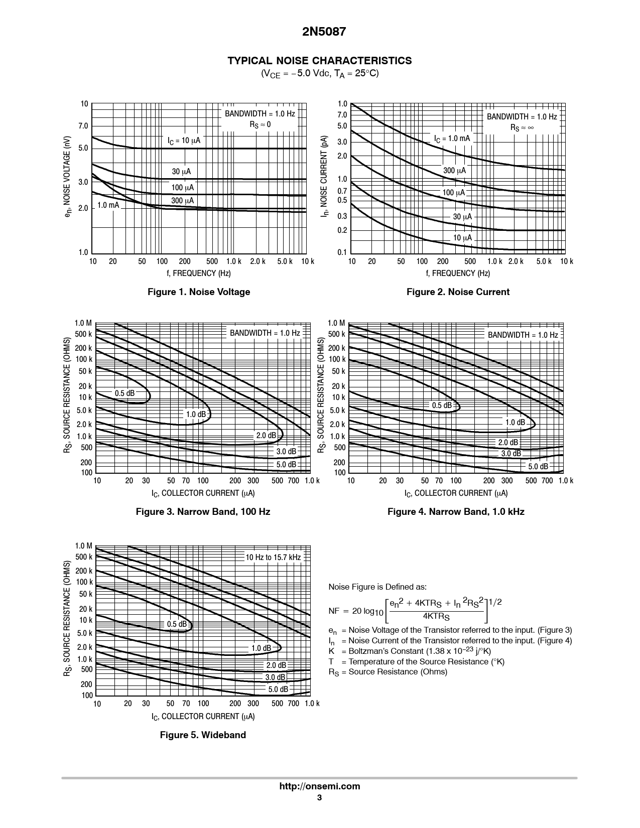 2N5087TYPICAL NOISE CHARACTERISTICS (VCE = − 5.0 Vdc, TA = 25°C) 10 1.0 BANDWIDTH = 1.0 Hz 7.0 BANDWIDTH = 1.0 Hz 7.0 RS ≈ 0 5.0 RS ≈ ∞ I I C = 10 mA 3.0 C = 1.0 mA (nV) 5.0 2.0 TAGE 30 mA 300 mA 3.0 1.0 100 mA 0.7 100 mA 300 mA 0.5 , NOISE VOL n 2.0 1.0 mA , NOISE CURRENT (pA) e I n 0.3 30 mA 0.2 10 mA 1.0 0.1 10 20 50 100 200 500 1.0k 2.0k 5.0k 10k 10 20 50 100 200 500 1.0k 2.0k 5.0k 10k f, FREQUENCY (Hz) f, FREQUENCY (Hz) Figure 1. Noise VoltageFigure 2. Noise Current 1.0M 1.0M 500k BANDWIDTH = 1.0 Hz 500k BANDWIDTH = 1.0 Hz 200k 200k (OHMS) 100k (OHMS) 100k 50k 50k ANCE ANCE 20k 20k 0.5 dB 10k 10k 0.5 dB 5.0k 1.0 dB 5.0k 2.0k 2.0k 1.0 dB 1.0k 2.0 dB , SOURCE RESIST , SOURCE RESIST 1.0k S 2.0 dB 500 S R 500 3.0 dB R 3.0 dB 200 200 5.0 dB 5.0 dB 100 100 10 20 30 50 70 100 200 300 500 700 1.0k 10 20 30 50 70 100 200 300 500 700 1.0k IC, COLLECTOR CURRENT (mA) IC, COLLECTOR CURRENT (mA) Figure 3. Narrow Band, 100 HzFigure 4. Narrow Band, 1.0 kHz 1.0M 500k 10 Hz to 15.7 kHz 200k (OHMS) 100k Noise Figure is Defined as: 50k ANCE 20k NF + 20 log ƪen2 ) 4KTRS ) In 2RS2ƫ1ń2 10 4KTR 10k S 0.5 dB en = Noise Voltage of the Transistor referred to the input. (Figure 3) 5.0k In = Noise Current of the Transistor referred to the input. (Figure 4) 2.0k 1.0 dB K = Boltzman’s Constant (1.38 x 10−23 j/°K) 1.0k , SOURCE RESIST T = Temperature of the Source Resistance (°K) S 2.0 dB 500 R RS = Source Resistance (Ohms) 3.0 dB 200 5.0 dB 100 10 20 30 50 70 100 200 300 500 700 1.0k IC, COLLECTOR CURRENT (mA) Figure 5. Widebandhttp://onsemi.com3