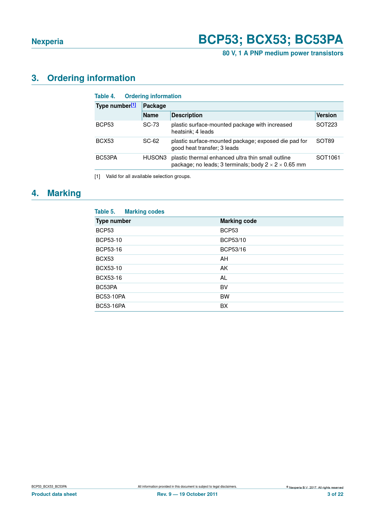 Nexperia. BCP53; BCX53; BC53PA. 80 V, 1 A PNP medium power transistors. 3. Ordering. information. Table 4. Ordering information