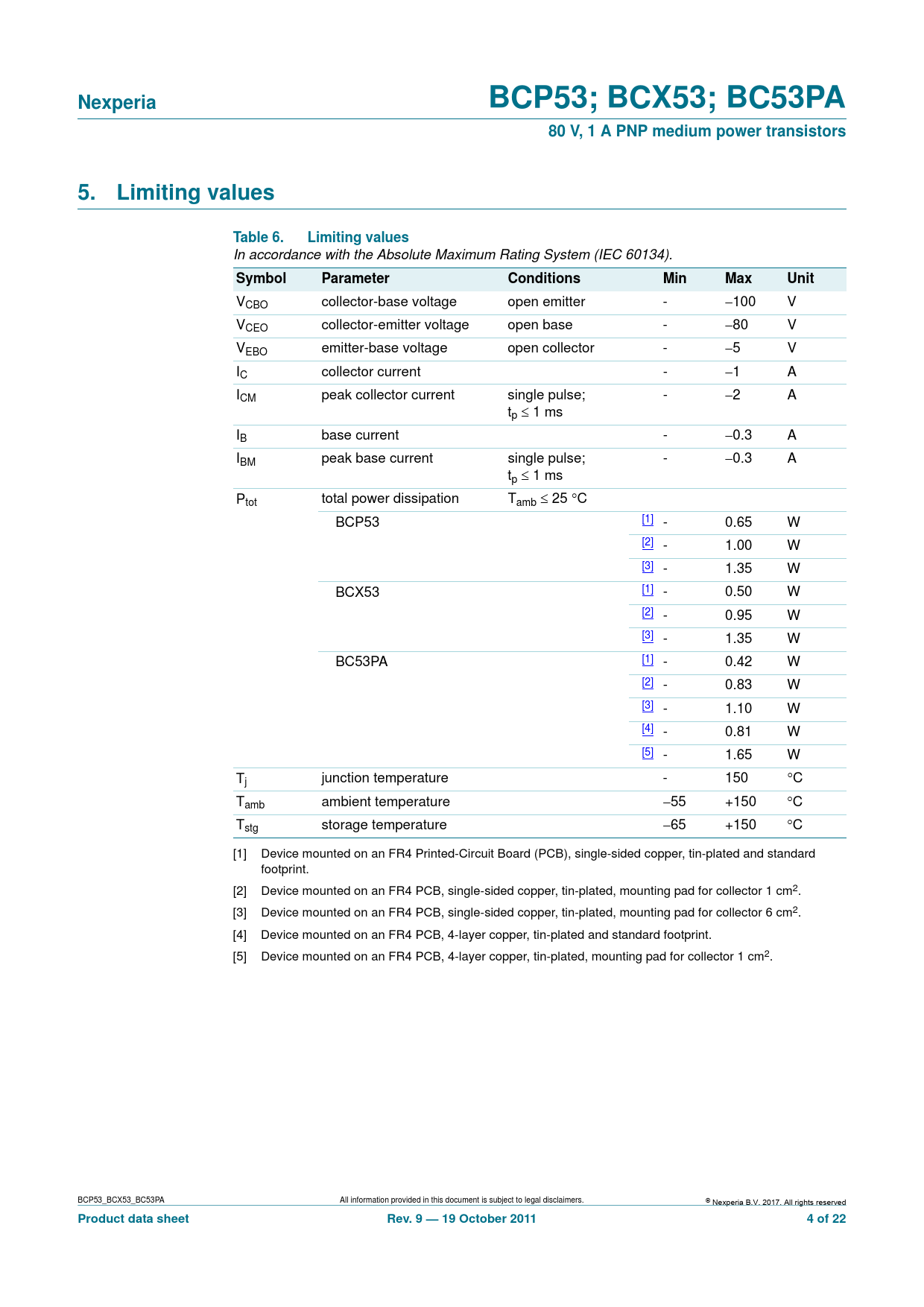 Nexperia. BCP53; BCX53; BC53PA. 80 V, 1 A PNP medium power transistors. Limiting. values. Table 6. Limiting values. Symbol. Parameter