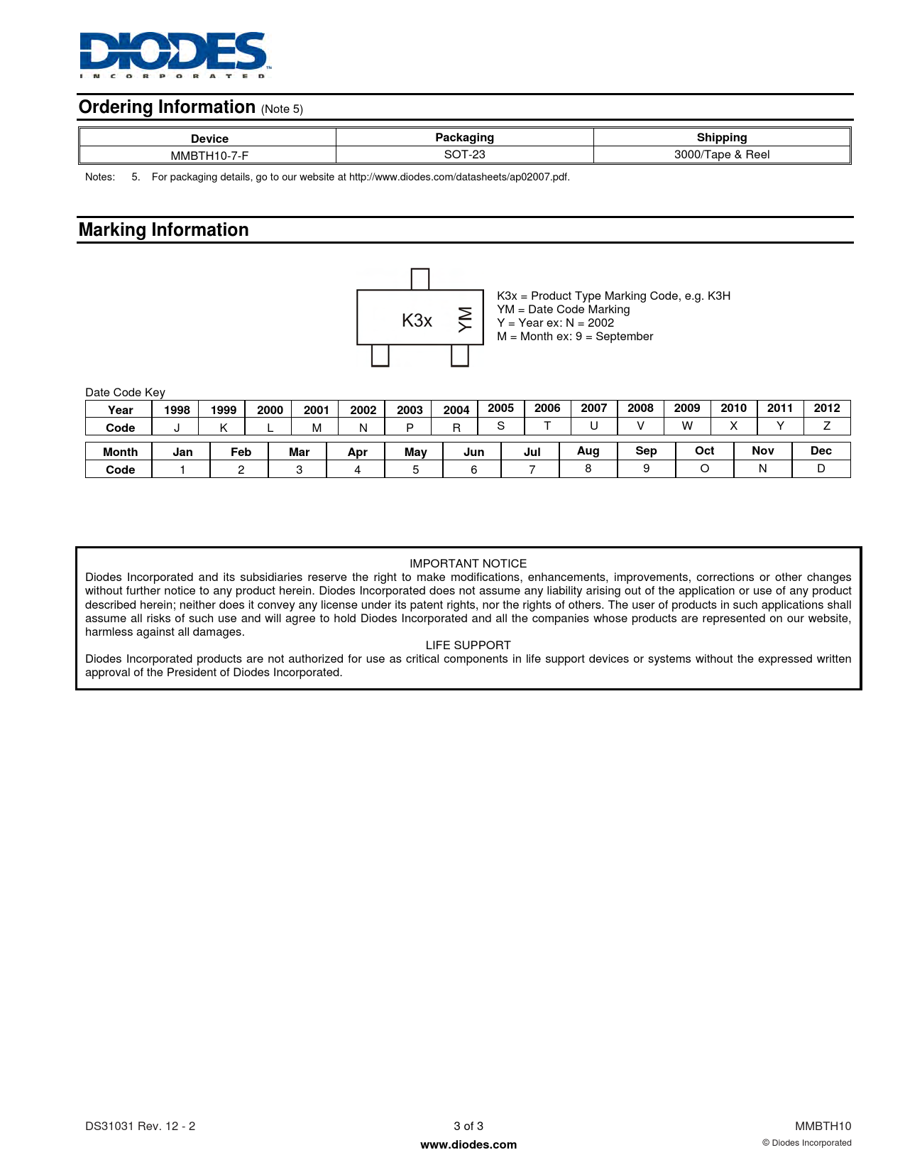 1 2 3 4 5 6 7 8 9 O N D IMPORTANT NOTICE Diodes Incorporated and its subsidiaries reserve the right to make modifications, enhancements, improvements, corrections or other changes without further notice to any product herein. Diodes Incorporated does not assume any liability arising out of the application or use of any product described herein; neither does it convey any license under its patent rights, nor the rights of others. The user of products in such applications shall assume all risks of such use and will agree to hold Diodes Incorporated and all the companies whose products are represented on our website, harmless against all damages. LIFE SUPPORT Diodes Incorporated products are not authorized for use as critical components in life support devices or systems without the expressed written approval of the President of Diodes Incorporated. DS31031 Rev. 12 - 2 3 of 3 MMBTH10