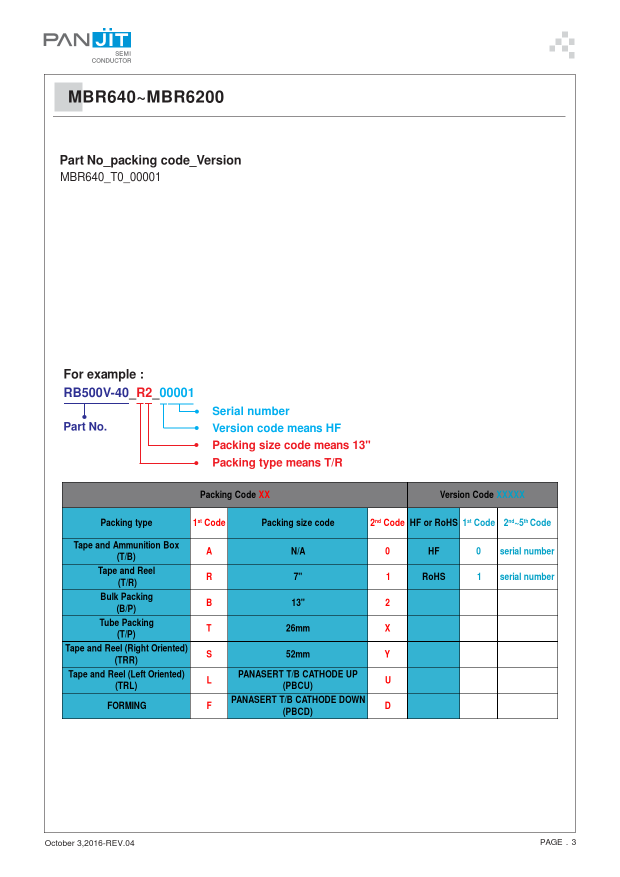 MBR640~MBR6200 Part No_packing code_Version. MBR640_T0_00001 For example :. RB500V-40_R2_00001. Serial number