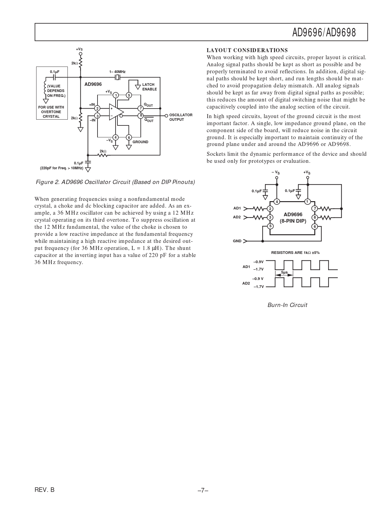 AD9696/AD9698 +VS LAYOUT CONSIDERATIONS 0.1µF 1– 40MHz AD9696 LATCH (VALUE ENABLE DEPENDS ON FREQ.) +IN QOUT FOR USE WITH OVERTONE