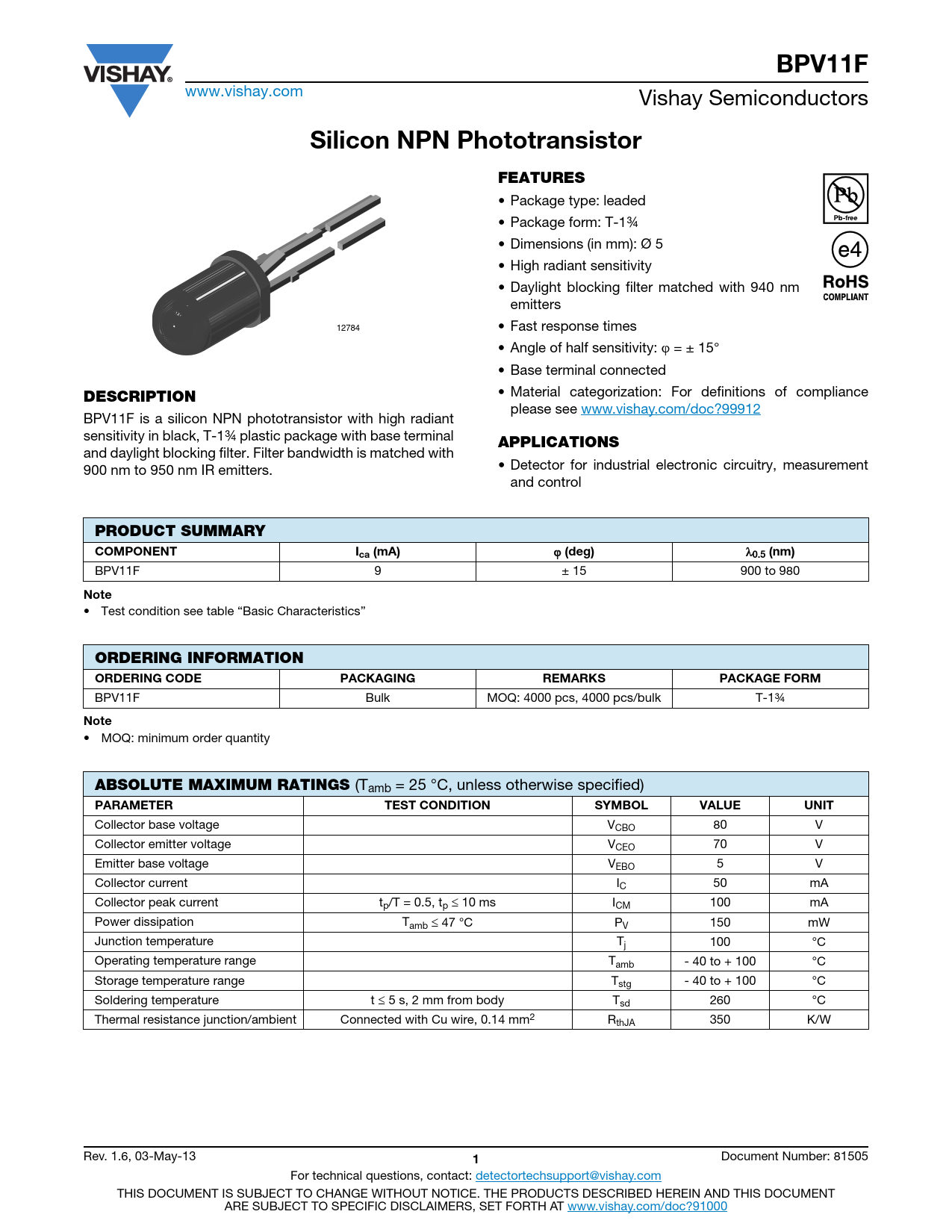 BPV11F www.vishay.com Vishay Semiconductors Silicon NPN PhototransistorFEATURES • Package type: leaded • Package form: T-1¾ • Dimensions (in mm): Ø 5 • High radiant sensitivity • Daylight blocking filter matched with 940 nm emitters 12784 • Fast response times • Angle of half sensitivity: = ± 15° • Base terminal connected DESCRIPTION • Material categorization: For definitions of compliance please see www.vishay.com/doc?99912 BPV11F is a silicon NPN phototransistor with high radiant sensitivity in black, T-1¾ plastic package with base terminal APPLICATIONS and daylight blocking filter. Filter bandwidth is matched with 900 nm to 950 nm IR emitters. • Detector for industrial electronic circuitry, measurement and control PRODUCT SUMMARYCOMPONENTIca (mA) (deg)0.5 (nm) BPV11F 9 ± 15 900 to 980 Note • Test condition see table “Basic Characteristics” ORDERING INFORMATIONORDERING CODEPACKAGINGREMARKSPACKAGE FORM BPV11F Bulk MOQ: 4000 pcs, 4000 pcs/bulk T-1¾ Note • MOQ: minimum order quantity ABSOLUTE MAXIMUM RATINGS (Tamb = 25 °C, unless otherwise specified) PARAMETERTEST CONDITIONSYMBOLVALUEUNIT Collector base voltage VCBO 80 V Collector emitter voltage VCEO 70 V Emitter base voltage VEBO 5 V Collector current IC 50 mA Collector peak current tp/T = 0.5, tp 10 ms ICM 100 mA Power dissipation Tamb 47 °C PV 150 mW Junction temperature Tj 100 °C Operating temperature range Tamb - 40 to + 100 °C Storage temperature range Tstg - 40 to + 100 °C Soldering temperature t 5 s, 2 mm from body Tsd 260 °C Thermal resistance junction/ambient Connected with Cu wire, 0.14 mm2 RthJA 350 K/W Rev. 1.6, 03-May-13 1 Document Number: 81505 For technical questions, contact: detectortechsupport@vishay.com THIS DOCUMENT IS SUBJECT TO CHANGE WITHOUT NOTICE. THE PRODUCTS DESCRIBED HEREIN AND THIS DOCUMENT ARE SUBJECT TO SPECIFIC DISCLAIMERS, SET FORTH AT www.vishay.com/doc?91000