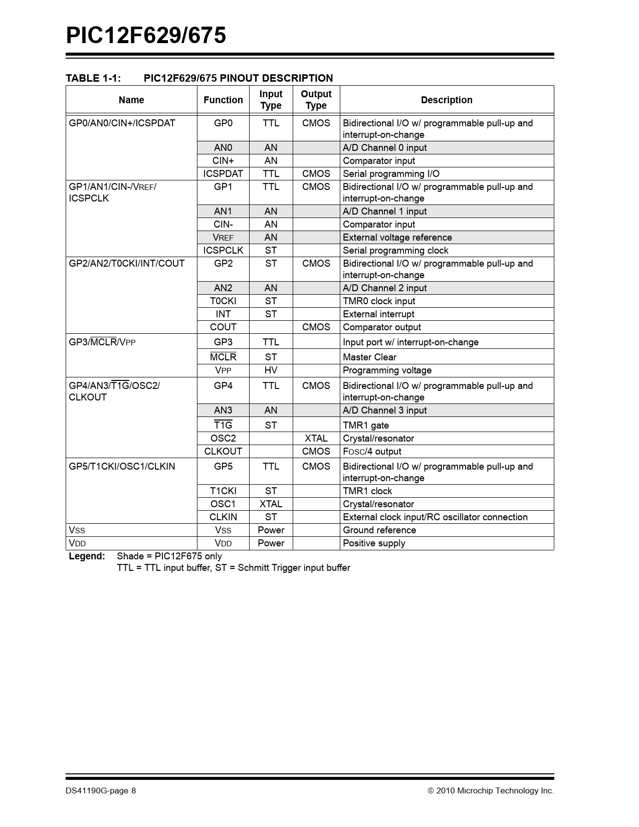 PIC12F629/675. TABLE 1-1:. PIC12F629/675 PINOUT DESCRIPTION. Input. Output. Name. Function. Description. Type. Legend:
