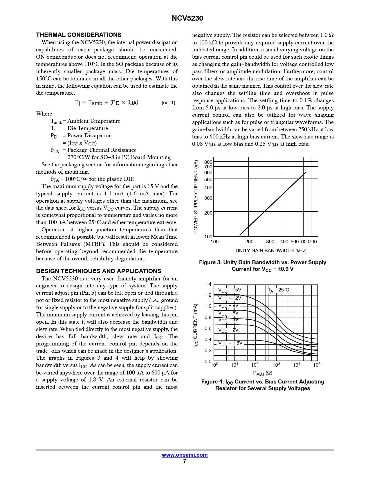 link to page 7 link to page 7 NCV5230THERMAL CONSIDERATIONS negative supply. The resistor can be selected between 1.0 W When using the NCV5230, the internal power dissipation to 100 kW to provide any required supply current over the capabilities of each package should be considered. indicated range. In addition, a small varying voltage on the ON Semiconductor does not recommend operation at die bias current control pin could be used for such exotic things temperatures above 110°C in the SO package because of its as changing the gain−bandwidth for voltage controlled low inherently smaller package mass. Die temperatures of pass filters or amplitude modulation. Furthermore, control 150°C can be tolerated in all the other packages. With this over the slew rate and the rise time of the amplifier can be in mind, the following equation can be used to estimate the obtained in the same manner. This control over the slew rate die temperature: also changes the settling time and overshoot in pulse Tj + Tamb ) (PD qJA) (eq. 1) response applications. The settling time to 0.1% changes from 5.0 ms at low bias to 2.0 ms at high bias. The supply Where current control can also be utilized for wave−shaping Tamb= Ambient Temperature applications such as for pulse or triangular waveforms. The Tj = Die Temperature gain−bandwidth can be varied from between 250 kHz at low PD = Power Dissipation bias to 600 kHz at high bias current. The slew rate range is = (ICC x VCC) 0.08 V/ms at low bias and 0.25 V/ms at high bias. qJA = Package Thermal Resistance = 270°C/W for SO−8 in PC Board Mounting See the packaging section for information regarding other 800 mA) 700 methods of mounting. 600 qJA − 100°C/W for the plastic DIP. 500 The maximum supply voltage for the part is 15 V and the 400 typical supply current is 1.1 mA (1.6 mA max). For Y CURRENT ( operation at supply voltages other than the maximum, see 300 the data sheet for ICC versus VCC curves. The supply current is somewhat proportional to temperature and varies no more 200 than 100 mA between 25°C and either temperature extreme. Operation at higher junction temperatures than that POWER SUPPL recommended is possible but will result in lower Mean Time 100 Between Failures (MTBF). This should be considered 100 200 300 400 500 600700 before operating beyond recommended die temperature UNITY GAIN BANDWIDTH (kHz) because of the overall reliability degradation. Figure 3. Unity Gain Bandwidth vs. Power SupplyDESIGN TECHNIQUES AND APPLICATIONSCurrent for VCC = ± 0.9 V The NCV5230 is a very user−friendly amplifier for an engineer to design into any type of system. The supply 1.4 current adjust pin (Pin 5) can be left open or tied through a VCC − 15V TA − 25°C 1.2 pot or fixed resistor to the most negative supply (i.e., ground VCC − 12V for single supply or to the negative supply for split supplies). 1.0 VCC − 9V The minimum supply current is achieved by leaving this pin VCC − 6V 0.8 open. In this state it will also decrease the bandwidth and VCC − 3V slew rate. When tied directly to the most negative supply, the 0.6 VCC − 2V device has full bandwidth, slew rate and ICC. The CURRENT (mA) 0.4 programming of the current−control pin depends on the VCC − 1.8V I CC trade−offs which can be made in the designer’s application. 0.2 The graphs in Figures 3 and 4 will help by showing 0.0 bandwidth versus ICC. As can be seen, the supply current can 100 101 102 103 104 105 be varied anywhere over the range of 100 mA to 600 mA for RADJ (W) a supply voltage of 1.8 V. An external resistor can be Figure 4. ICC Current vs. Bias Current Adjusting inserted between the current control pin and the most Resistor for Several Supply Voltageswww.onsemi.com7