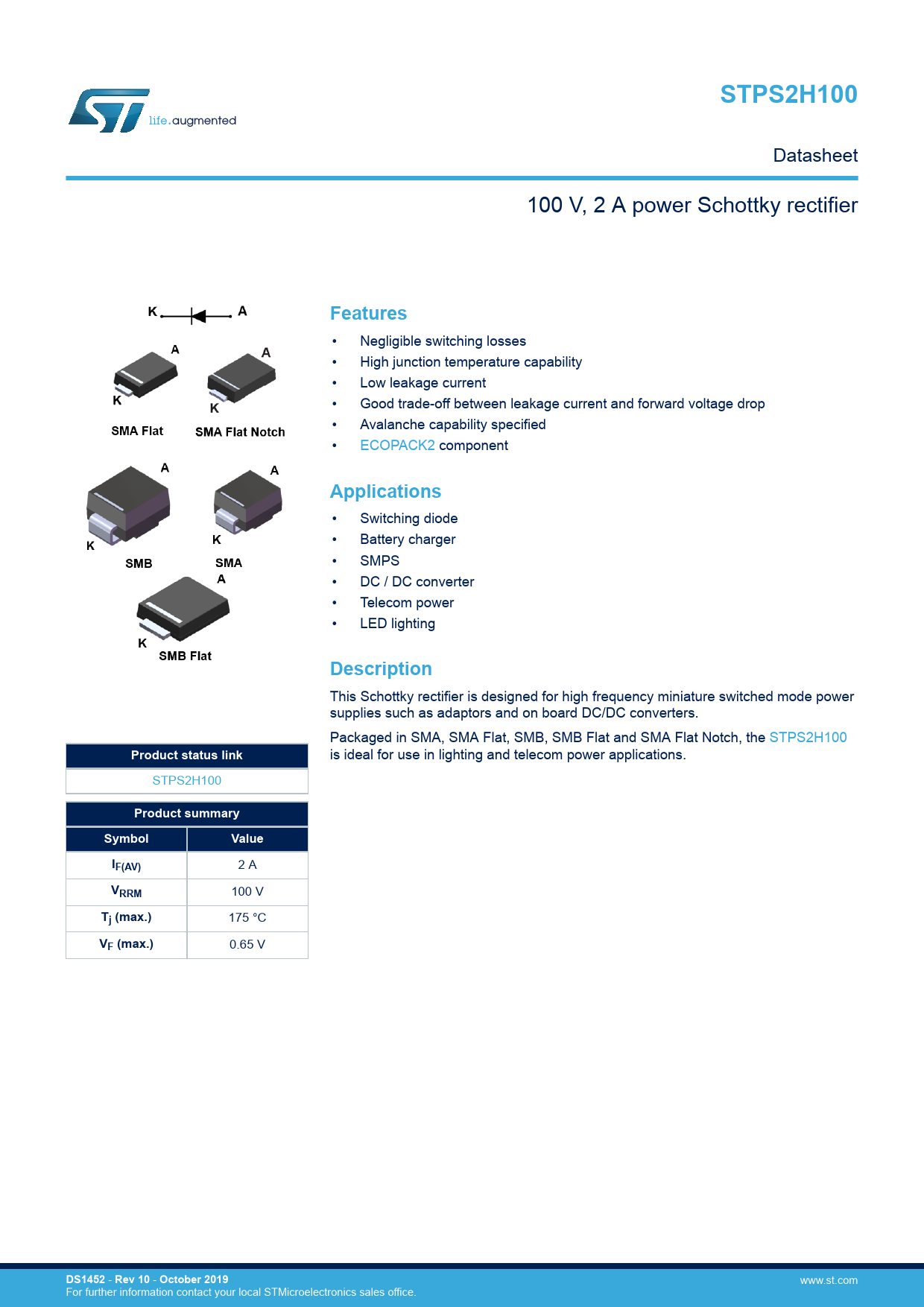 is ideal for use in lighting and telecom power applications. STPS2H100