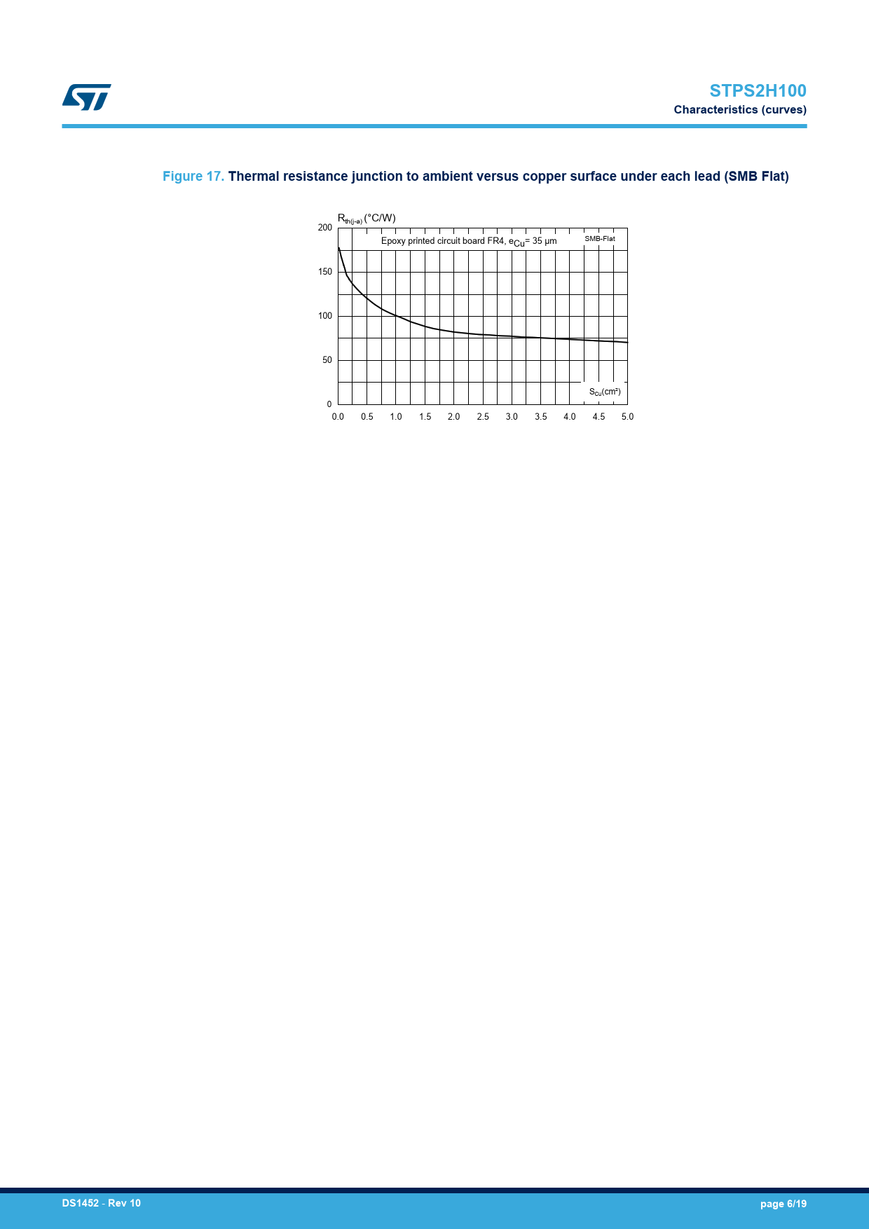 STPS2H100 Characteristics (curves) Figure 17. Thermal resistance junction to ambient versus copper surface under each lead (SMB Flat)