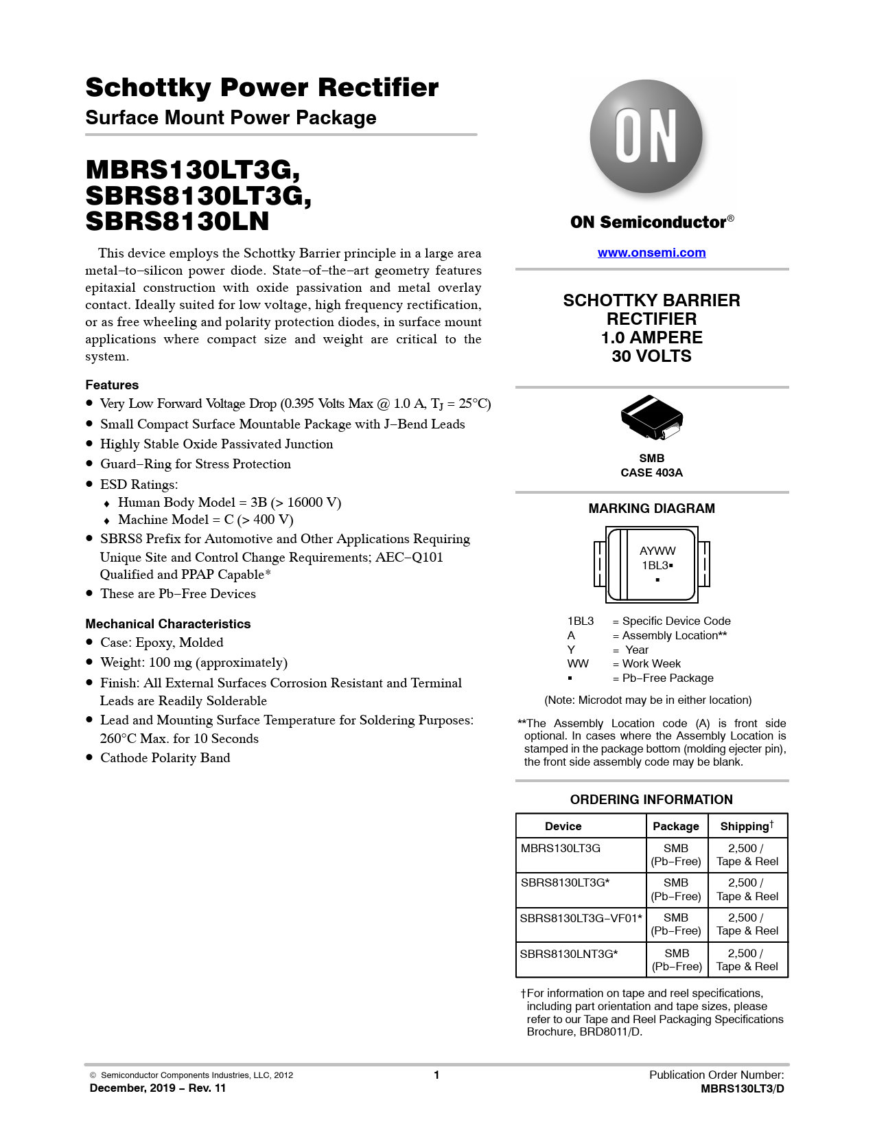 Surface Mount Power Package. www.onsemi.com. SCHOTTKY BARRIER. RECTIFIER. 1.0 AMPERE. 30 VOLTS. Features. SMB. CASE 403A. MARKING DIAGRAM