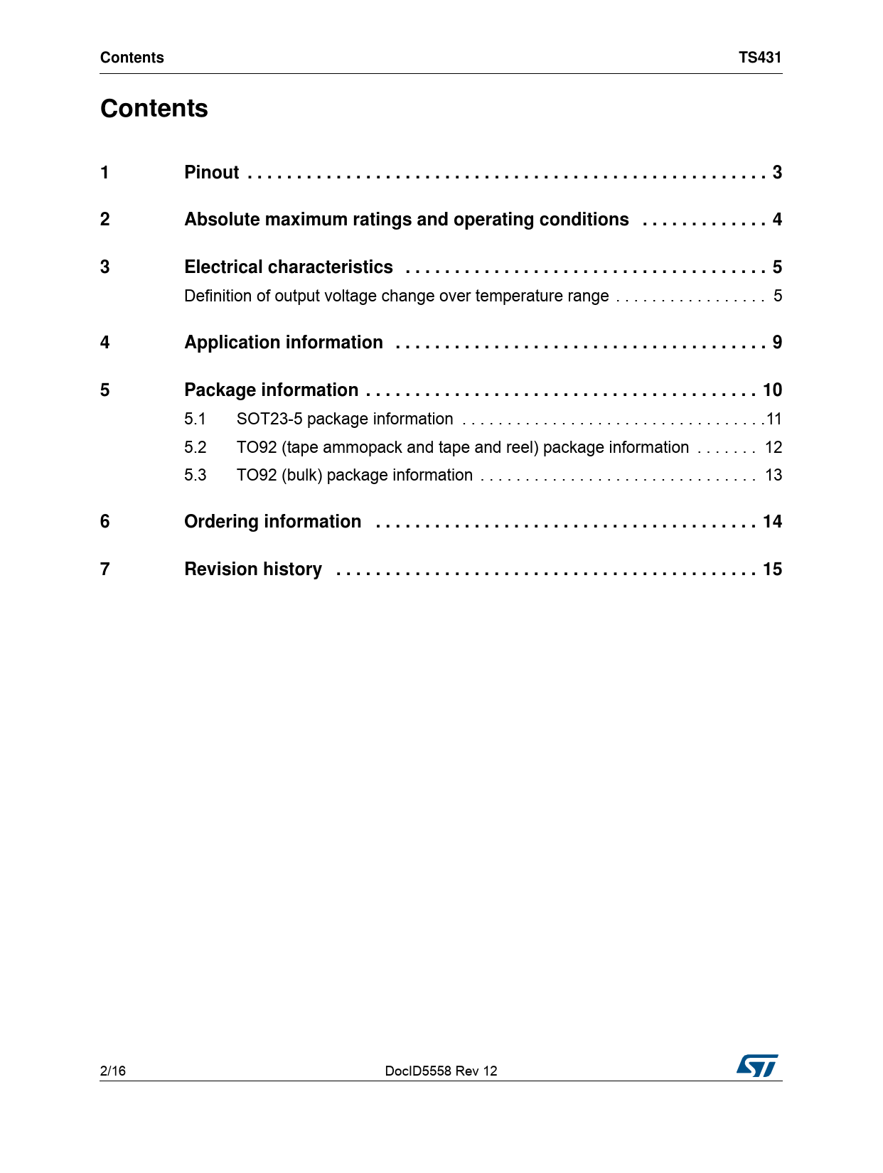 Contents TS431 Contents 1 Pinout . 3 2 Absolute maximum ratings and operating conditions . 4 3 Electrical characteristics . 5