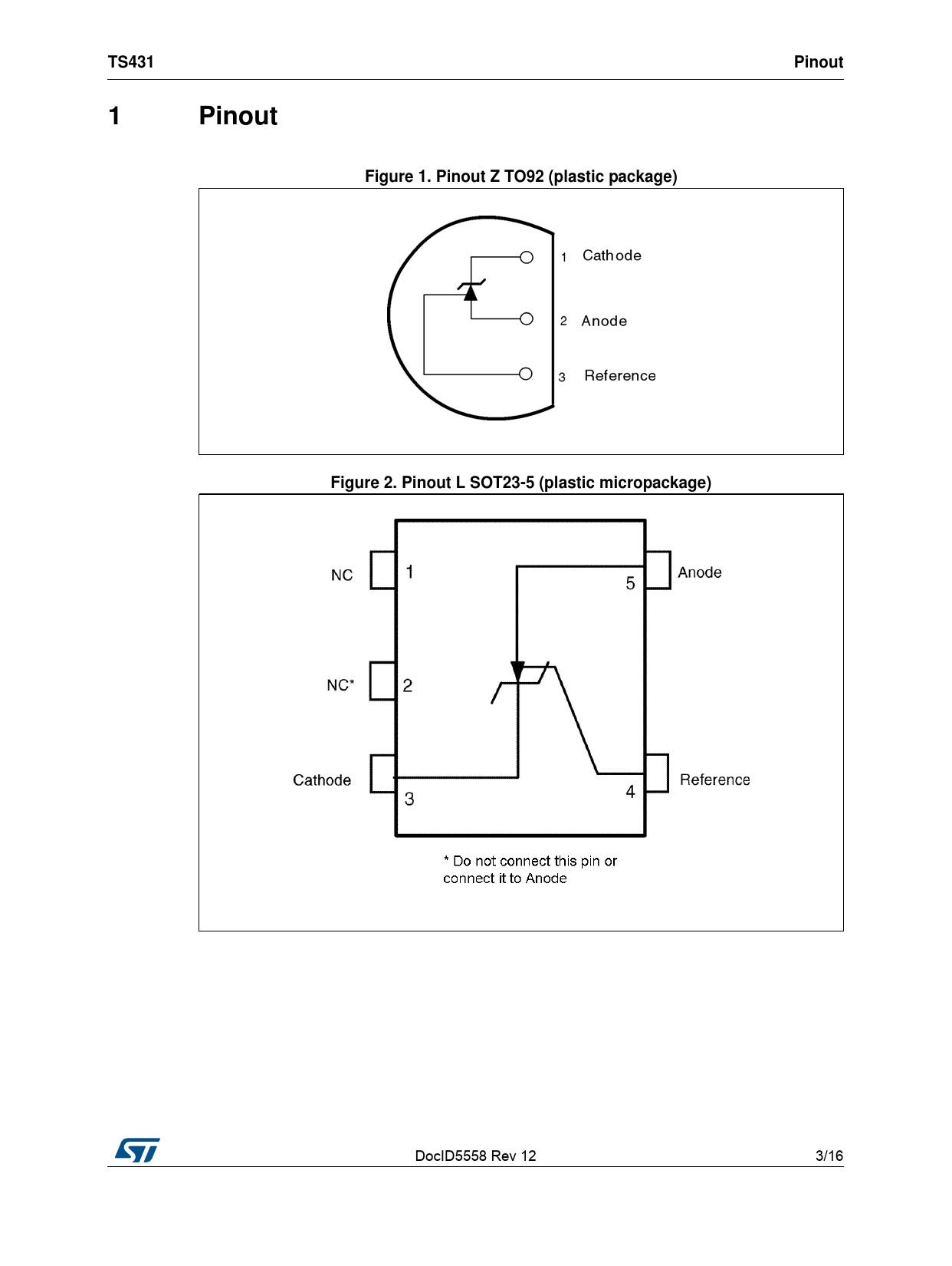 TS431Pinout1 PinoutFigure 1. Pinout Z TO92 (plastic package)Figure 2. Pinout L SOT23-5 (plastic micropackage) DocID5558 Rev 12 3/16 16 Document Outline 1 Pinout Figure 1. Pinout Z TO92 (plastic package) Figure 2. Pinout L SOT23-5 (plastic micropackage) 2 Absolute maximum ratings and operating conditions Table 1. Absolute maximum ratings Table 2. Operating conditions Table 3. Thermal data 3 Electrical characteristics Table 4. Tamb = 25 °C (unless otherwise specified) Definition of output voltage change over temperature range Figure 3. Output voltage change over temperature range Figure 4. Reference voltage vs. temperature Figure 5. Test circuit for VKA = Vref Figure 6. Cathode voltage vs. cathode current Figure 7. Cathode voltage vs. cathode current Figure 8. Reference input current vs. temperature Figure 9. Static impedance vs. temperature Figure 10. Off-state current vs. temperature Figure 11. Test circuit for off-state current measurement Figure 12. Ratio of change in reference input voltage to change in VKA voltage vs. temperature Figure 13. Test circuit for VKA > Vref Figure 14. Phase and gain vs. frequency Figure 15. Test circuit for phase and gain measurement Figure 16. Pulse response at Ik = 100 µA Figure 17. Test circuit for pulse response at Ik = 100 µA Figure 18. Pulse response at Ik = 1 mA Figure 19. Test circuit for pulse response at Ik = 1 mA Figure 20. Equivalent input noise vs. frequency 4 Application information 5 Package information 5.1 SOT23-5 package information Figure 21. SOT23-5 package outline Table 5. SOT23-5 package mechanical data 5.2 TO92 (tape ammopack and tape and reel) package information Figure 22. TO92 (tape ammopack and tape and reel) package outline Table 6. TO92 (tape ammopack and tape and reel) package mechanical data 5.3 TO92 (bulk) package information Figure 23. TO92 (bulk) package outline Table 7. TO92 (bulk) package mechanical data 6 Ordering information Table 8. Order codes 7 Revision history Table 9. Document revision history