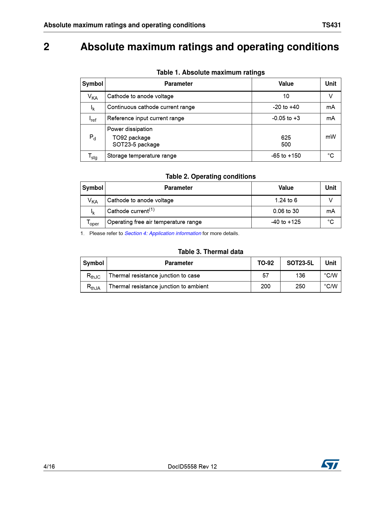 Pages / Page16 / 4 — Absolute maximum ratings and operating conditions. TS431. Table 1. …