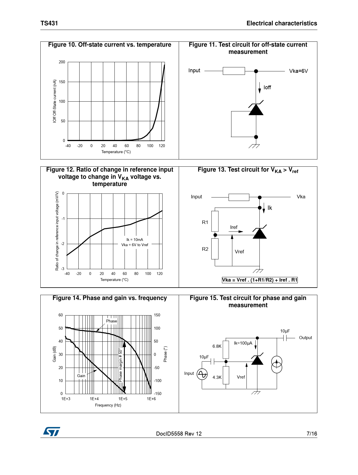 TS431Electrical characteristicsFigure 10. Off-state current vs. temperatureFigure 11. Test circuit for off-state currentmeasurement 200 Input Vka=6V A) 150 nt (n Ioff 100 tate curre IOff Off-S 50 0 -40 -20 0 20 40 60 80 100 120 Temperature (°C) Figure 12. Ratio of change in reference inputFigure 13. Test circuit for VKA > Vrefvoltage to change in VKA voltage vs.temperature 0 V/V) Input Vka m ge ( ta Ik ut vol -1 R1 e inp Iref renc refe Ik = 10mA -2 Vka = 6V to Vref ge in R2 Vref of chan Ratio -3 -40 -20 0 20 40 60 80 100 120 Temperature (°C) Vka = Vref . (1+R1/R2) + Iref . R1Figure 14. Phase and gain vs. frequencyFigure 15. Test circuit for phase and gainmeasurement 60 150 Phase 50 100 10µF Output 40 50 Ik=100µA ) 6.8K e (°) 30 50° 0 has 10µF Gain (dB P 20 -50 se margin # Input Gain 4.3K Vref 10 Pha -100 0 -150 1E+3 1E+4 1E+5 1E+6 Frequency (Hz) DocID5558 Rev 12 7/16 16 Document Outline 1 Pinout Figure 1. Pinout Z TO92 (plastic package) Figure 2. Pinout L SOT23-5 (plastic micropackage) 2 Absolute maximum ratings and operating conditions Table 1. Absolute maximum ratings Table 2. Operating conditions Table 3. Thermal data 3 Electrical characteristics Table 4. Tamb = 25 °C (unless otherwise specified) Definition of output voltage change over temperature range Figure 3. Output voltage change over temperature range Figure 4. Reference voltage vs. temperature Figure 5. Test circuit for VKA = Vref Figure 6. Cathode voltage vs. cathode current Figure 7. Cathode voltage vs. cathode current Figure 8. Reference input current vs. temperature Figure 9. Static impedance vs. temperature Figure 10. Off-state current vs. temperature Figure 11. Test circuit for off-state current measurement Figure 12. Ratio of change in reference input voltage to change in VKA voltage vs. temperature Figure 13. Test circuit for VKA > Vref Figure 14. Phase and gain vs. frequency Figure 15. Test circuit for phase and gain measurement Figure 16. Pulse response at Ik = 100 µA Figure 17. Test circuit for pulse response at Ik = 100 µA Figure 18. Pulse response at Ik = 1 mA Figure 19. Test circuit for pulse response at Ik = 1 mA Figure 20. Equivalent input noise vs. frequency 4 Application information 5 Package information 5.1 SOT23-5 package information Figure 21. SOT23-5 package outline Table 5. SOT23-5 package mechanical data 5.2 TO92 (tape ammopack and tape and reel) package information Figure 22. TO92 (tape ammopack and tape and reel) package outline Table 6. TO92 (tape ammopack and tape and reel) package mechanical data 5.3 TO92 (bulk) package information Figure 23. TO92 (bulk) package outline Table 7. TO92 (bulk) package mechanical data 6 Ordering information Table 8. Order codes 7 Revision history Table 9. Document revision history