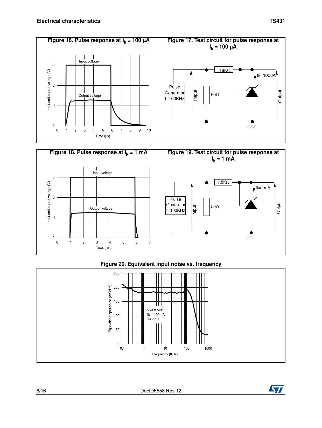 Electrical characteristicsTS431Figure 16. Pulse response at Ik = 100 µAFigure 17. Test circuit for pulse response atIk = 100 µA Input voltage 3 18K (V) Ik=100µA oltage 2 Pulse put v t Generator Output voltage put 50 d out f=100KHz Intpu an Out 1 put in 0 0 1 2 3 4 5 6 7 8 9 10 Time (µs) Figure 18. Pulse response at Ik = 1 mAFigure 19. Test circuit for pulse response atIk = 1 mA Input voltage 3 1.8K (V) Ik=1mA oltage 2 Pulse put v ut Generator ut 50 tp d out Output voltage f=100KHz tp Ou an In 1 put in 0 0 1 2 3 4 5 6 7 Time (µs) Figure 20. Equivalent input noise vs. frequency 250 z) 200 H V v/ se (n 150 t noi Vka = Vref inpu 100 Ik = 100 µA T=25°C valent qui 50 E 0 0.1 1 10 100 1000 Frequency (KHz) 8/16 DocID5558 Rev 12 Document Outline 1 Pinout Figure 1. Pinout Z TO92 (plastic package) Figure 2. Pinout L SOT23-5 (plastic micropackage) 2 Absolute maximum ratings and operating conditions Table 1. Absolute maximum ratings Table 2. Operating conditions Table 3. Thermal data 3 Electrical characteristics Table 4. Tamb = 25 °C (unless otherwise specified) Definition of output voltage change over temperature range Figure 3. Output voltage change over temperature range Figure 4. Reference voltage vs. temperature Figure 5. Test circuit for VKA = Vref Figure 6. Cathode voltage vs. cathode current Figure 7. Cathode voltage vs. cathode current Figure 8. Reference input current vs. temperature Figure 9. Static impedance vs. temperature Figure 10. Off-state current vs. temperature Figure 11. Test circuit for off-state current measurement Figure 12. Ratio of change in reference input voltage to change in VKA voltage vs. temperature Figure 13. Test circuit for VKA > Vref Figure 14. Phase and gain vs. frequency Figure 15. Test circuit for phase and gain measurement Figure 16. Pulse response at Ik = 100 µA Figure 17. Test circuit for pulse response at Ik = 100 µA Figure 18. Pulse response at Ik = 1 mA Figure 19. Test circuit for pulse response at Ik = 1 mA Figure 20. Equivalent input noise vs. frequency 4 Application information 5 Package information 5.1 SOT23-5 package information Figure 21. SOT23-5 package outline Table 5. SOT23-5 package mechanical data 5.2 TO92 (tape ammopack and tape and reel) package information Figure 22. TO92 (tape ammopack and tape and reel) package outline Table 6. TO92 (tape ammopack and tape and reel) package mechanical data 5.3 TO92 (bulk) package information Figure 23. TO92 (bulk) package outline Table 7. TO92 (bulk) package mechanical data 6 Ordering information Table 8. Order codes 7 Revision history Table 9. Document revision history