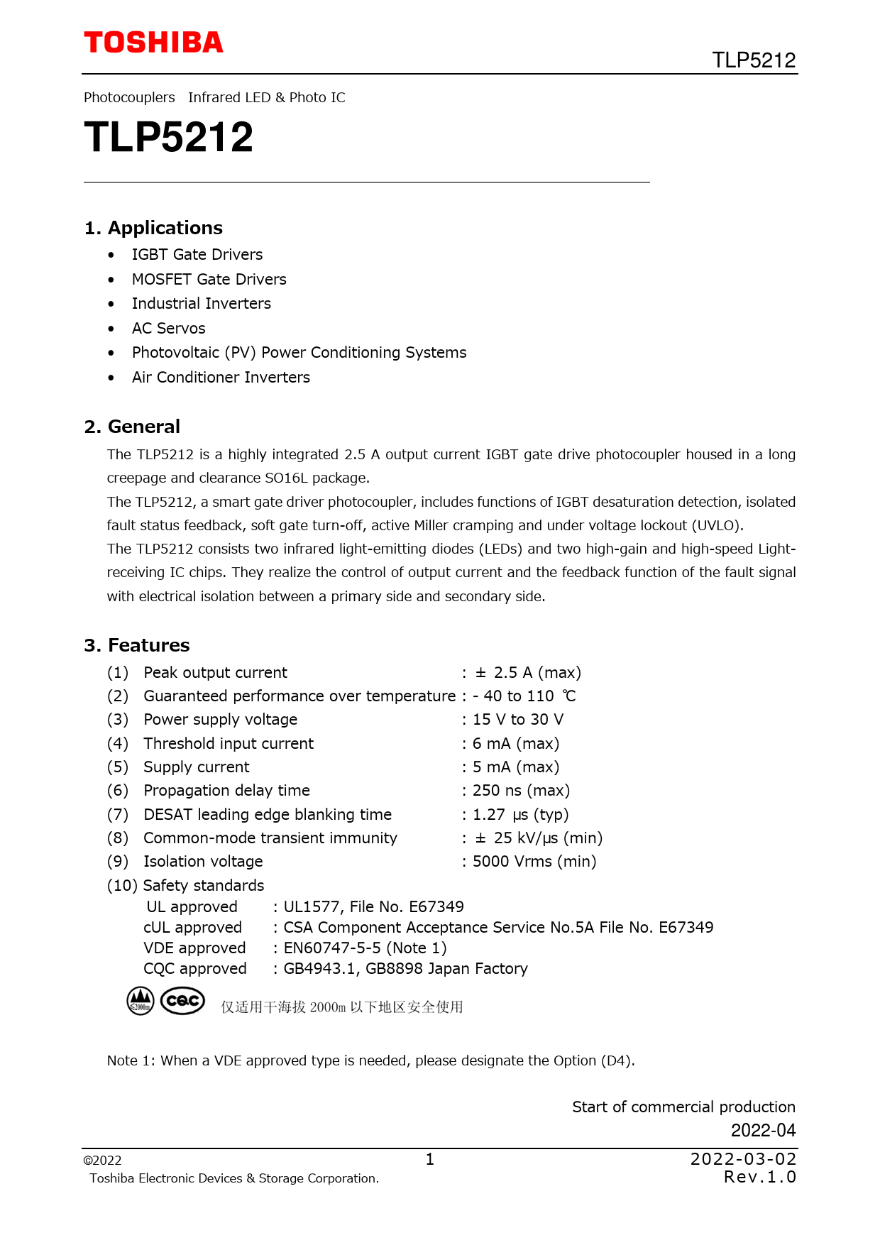 (1) Peak output current : ± 2.5 A (max) (2) Guaranteed performance over temperature : - 40 to 110 ℃ (3) Power supply voltage : 15 V to 30 V (4) Threshold input current : 6 mA (max) (5) Supply current : 5 mA (max) (6) Propagation delay time : 250 ns (max) (7) DESAT leading edge blanking time : 1.27 μs (typ) (8) Common-mode transient immunity : ± 25 kV/μs (min) (9) Isolation voltage : 5000 Vrms (min) (10) Safety standards UL approved : UL1577, File No. E67349 cUL approved : CSA Component Acceptance Service No.5A File No. E67349 VDE approved : EN60747-5-5 (Note 1) CQC approved : GB4943.1, GB8898 Japan Factory Note 1: When a VDE approved type is needed, please designate the Option (D4). Start of commercial production 2022-04 ©2022 1 2022-03-02 Toshiba Electronic Devices & Storage Corporation. Rev.1.0